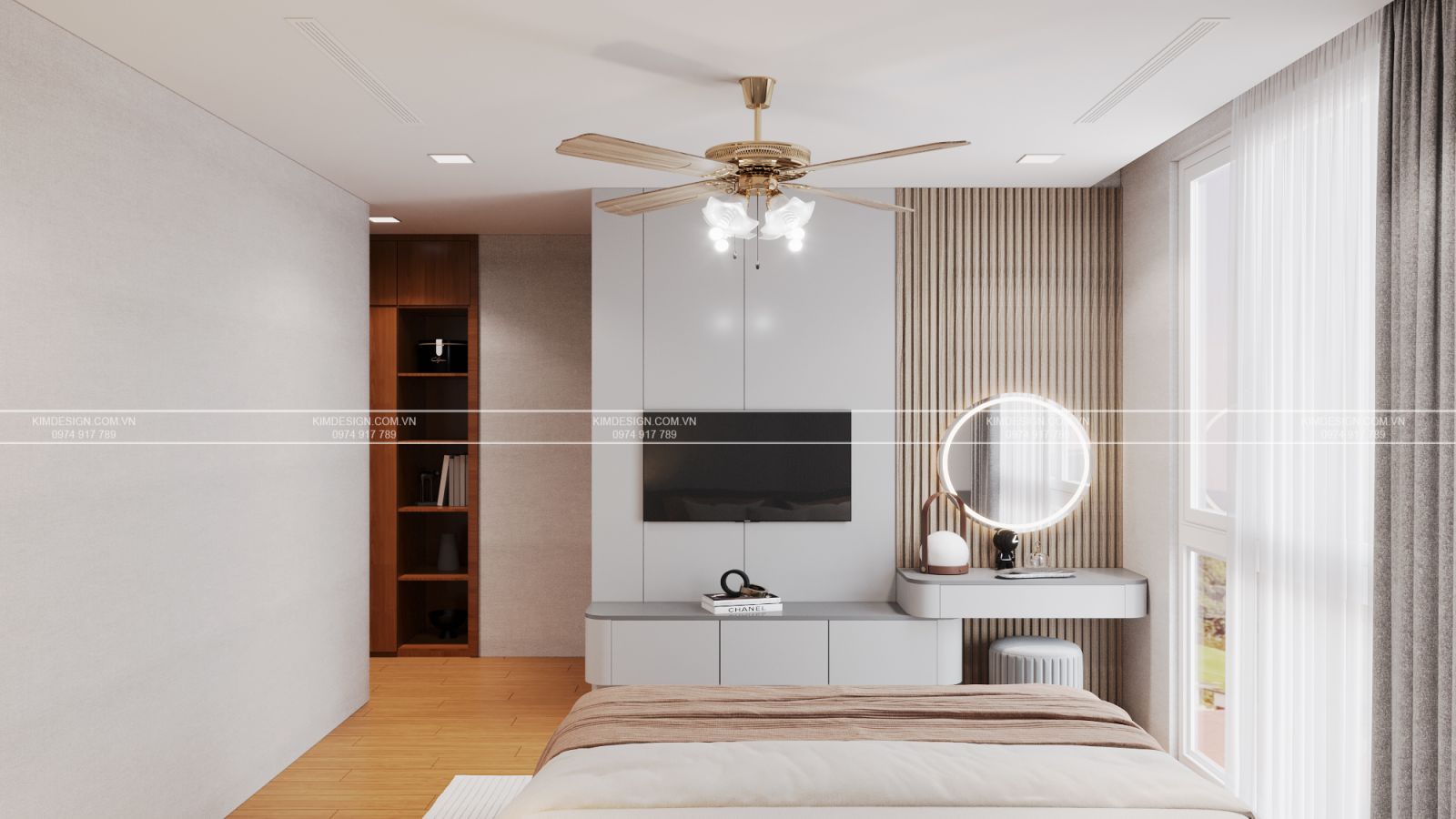 Không gian phòng ngủ được thiết kế với sự chú trọng đặc biệt đến sự thoải mái và tính thẩm mỹ, tạo nên một chốn riêng tư lý tưởng để nghỉ ngơi và tái tạo năng lượng. Tâm điểm của căn phòng là giường ngủ lớn, mang đến cảm giác êm ái và thư thái sau một ngày dài làm việc. Vách ốp đầu giường được trang trí tinh tế, tạo điểm nhấn ấn tượng cho không gian. Đối diện giường ngủ là vách kệ tivi kết hợp bàn trang điểm có gương soi tiện lợi. Sự kết hợp thông minh này không chỉ tối ưu hóa diện tích mà còn mang đến sự tiện lợi tối đa cho gia chủ. Tất cả hòa quyện để tạo nên một không gian phòng ngủ tối giản nhưng không kém phần hiện đại, nơi bạn có thể tìm thấy sự an yên và thư thái tuyệt đối.
