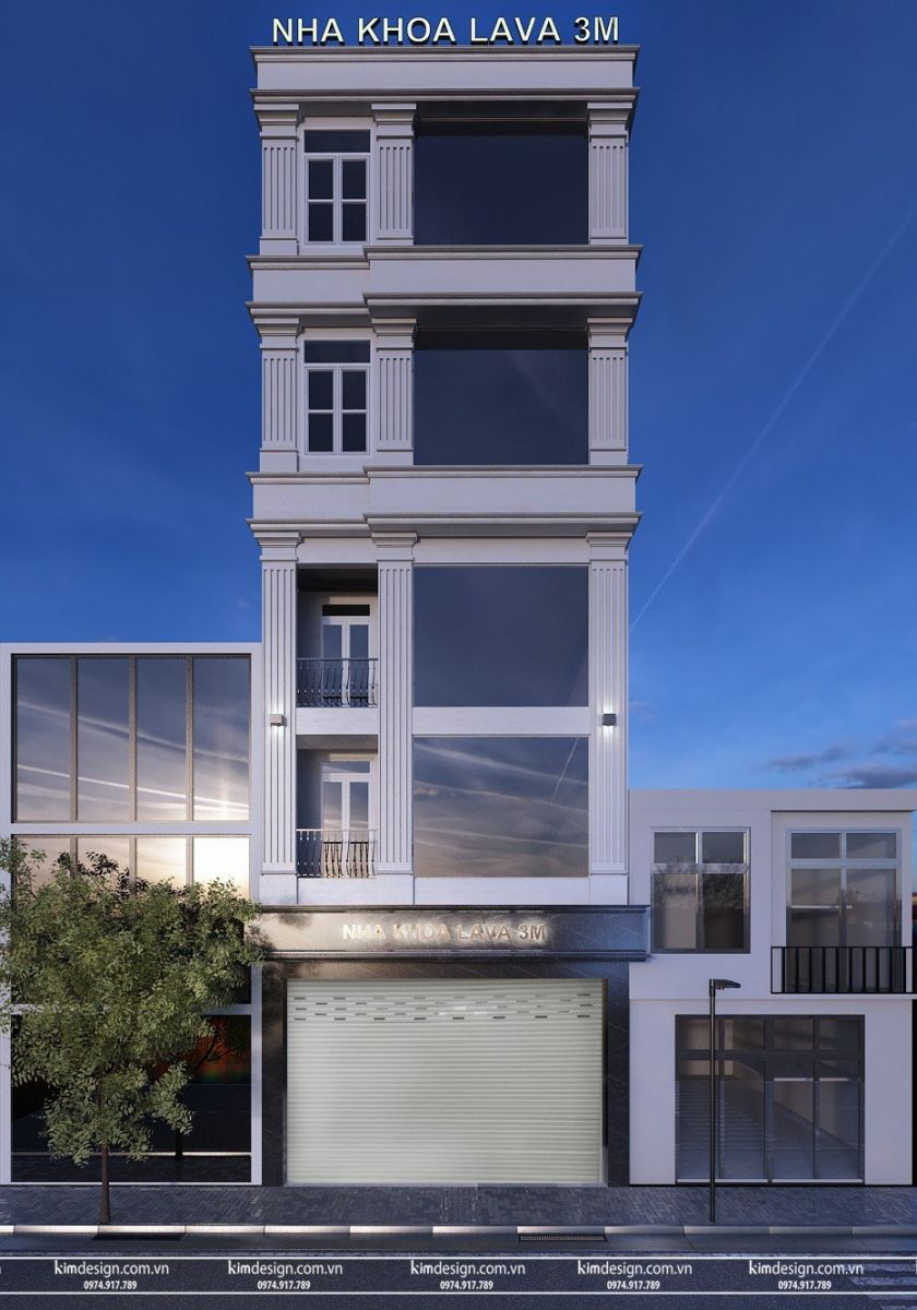Với những nha khoa có lầu, nên làm biển hiệu càng tinh gọn càng tốt. Biển hiệu được gắn bằng phông chữ đơn giản có hộp đèn tạo độ sáng, và gắn cả bên dưới lẫn trên cùng căn nhà để chạm được tới mọi góc nhìn. Mặt tiền tuy được thiết kế tinh giản nhưng vẫn gây ấn tượng với các trụ cột màu trắng nối đều nhau và phần đá hoa cương đen sang trọng.