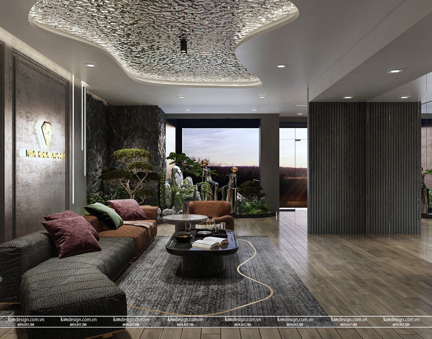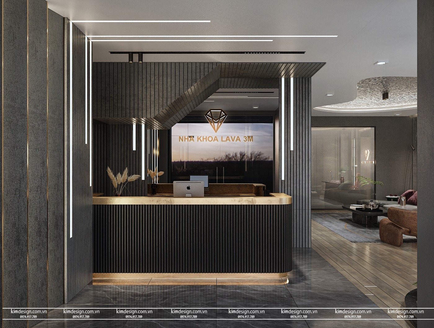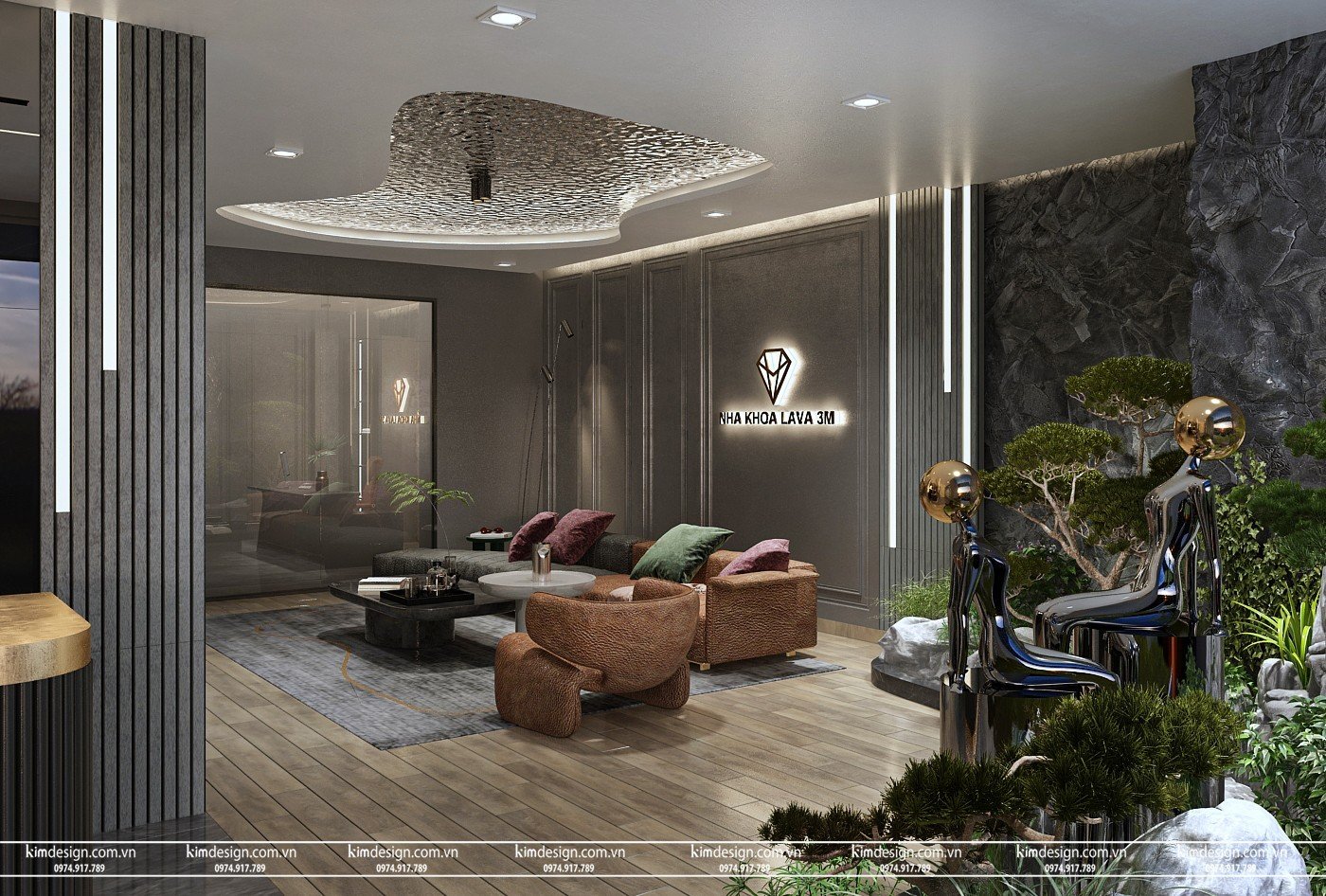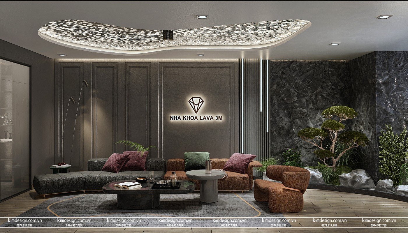 Tiếp đến là khu vực tiếp khách, khu vực này vừa là nơi tiếp xúc đầu tiên của khách cũng là nơi cuối cùng khách chờ khi ra về, nên cần được đầu tư tỉ mỉ tạo độ uy tín và chiếm được tình cảm tốt từ khách hàng. Với không gian tối màu, KimDesign sử dụng bộ bàn ghế mang gam màu như tím, xanh, nâu có sắc độ trầm vừa phải không quá sáng chói nhằm tô điểm thêm mà không mất đi sự sang trọng. Để tránh những khoảng trống, logo hộp đèn là sự lựa chọn tối ưu cho căn phòng.