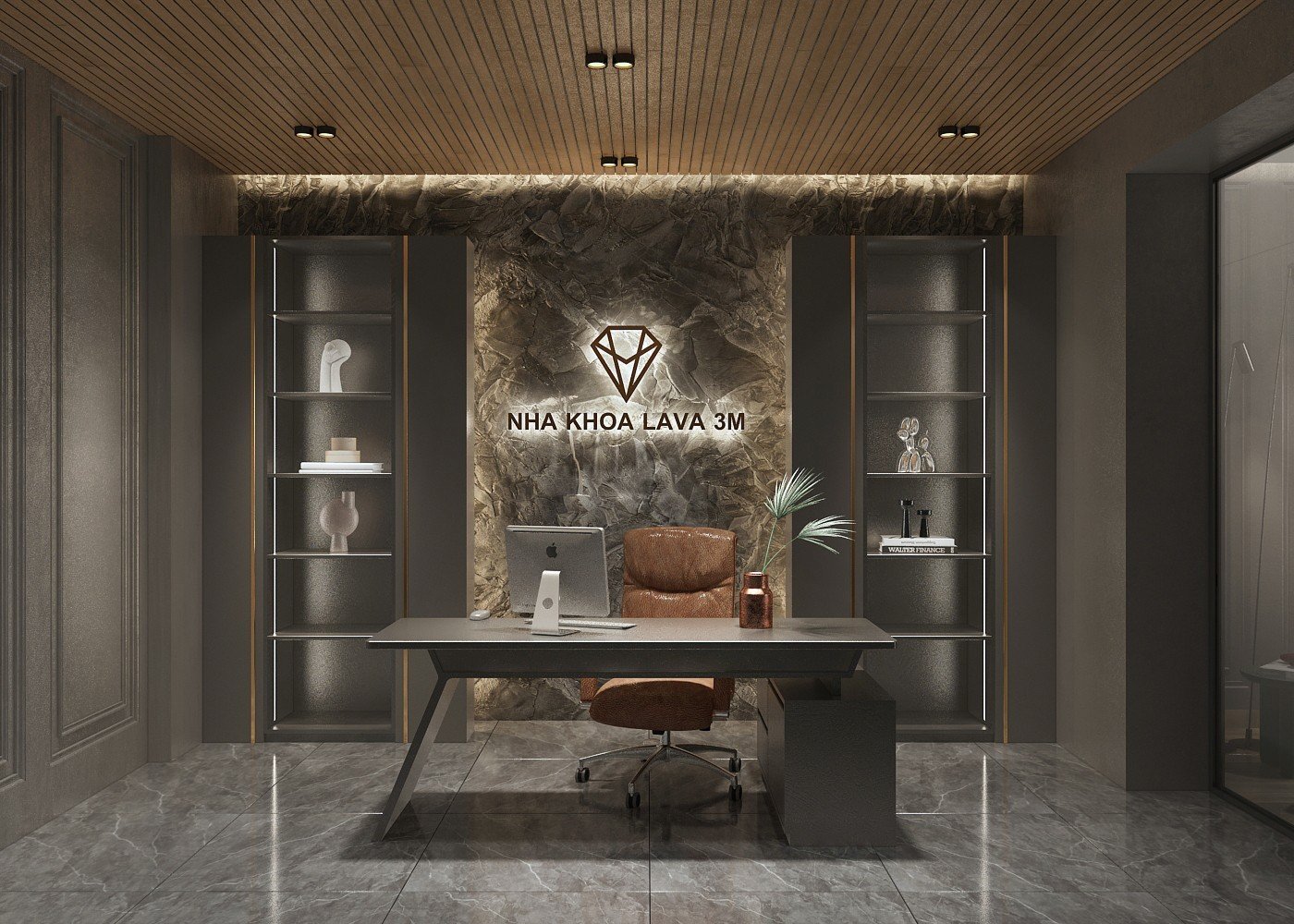 Phòng làm việc của bác sỹ vô cùng sang trọng với tone màu nâu- xám, phía sau nổi bật mới đá hoa cương cao cấp, kệ trưng bày và đèn led bố trí song song tạo cảm giác chuyên nghiệp, ghế ngồi màu nâu đồng bộ với trần gỗ mang cảm giác ấm áp cho căn phòng.