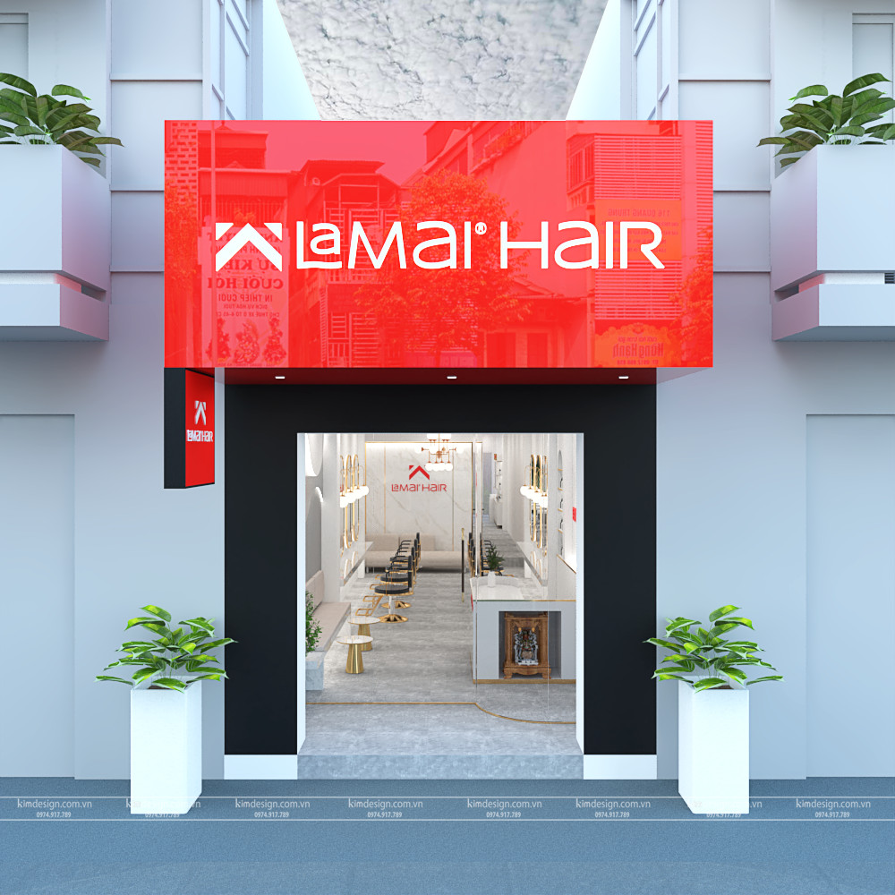 Mặt tiền bên ngoài salon là hình ảnh quan trọng giúp khách hàng định hình ra dịch vụ kinh doanh của bạn. Thiết kế salon thiết kế mặt tiền đơn giản và nổi bật với gam màu mặt tiền màu đen bảng hiệu màu đỏ logo chữ trắng tạo sự nổi bật mặt tiền salon thu hút người đi đường.