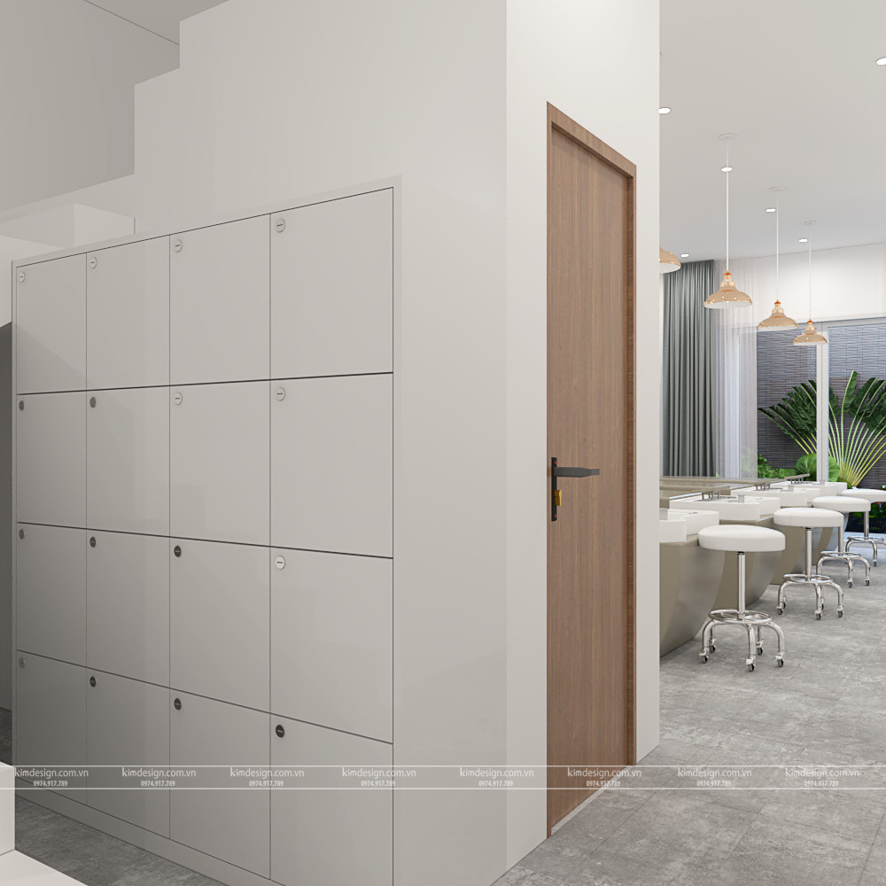 Phía trong là phòng gội đầu,thiết kế tủ nhiều ngăn và có chìa khóa riêng để khách hoặc nhân viên đựng đồ cá nhân của mình.