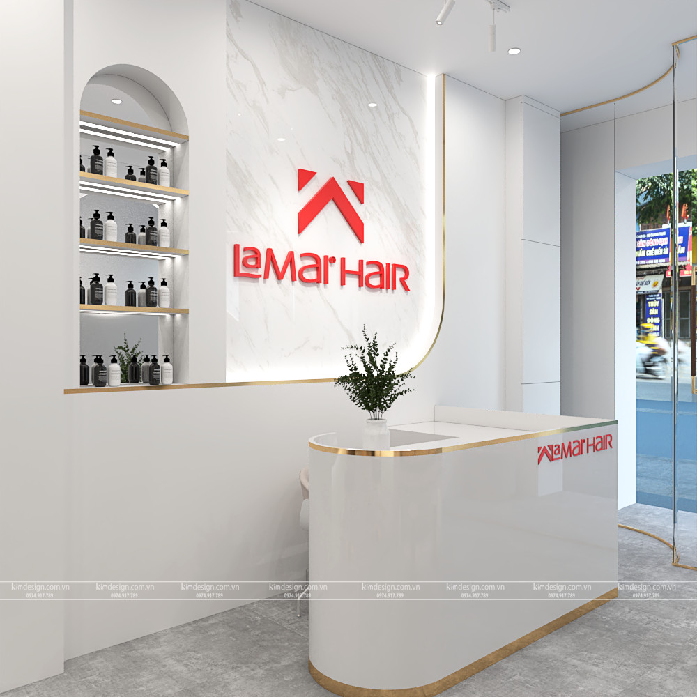 Quầy thu ngân được đặt sát cửa chính ra vào dễ dàng quản lý các hoạt động kinh doanh đang diễn ra trong salon vừa thuận tiện chào đón khách hàng. Trên bàn thu ngân đặt một chậu hoa với kích thước phù hợp làm điểm nhấn nổi bật. Phía sau quầy thu ngân là vách logo nền giả đá PVC logo đỏ trang trí đèn les vách logo. Phối hợp màu sắc hiện đại và sang trọng giúp khách hàng ấn tượng với logo ngay khi nhìn vào. Kế bên thiết kế kệ trưng bày sản phẩm salon.