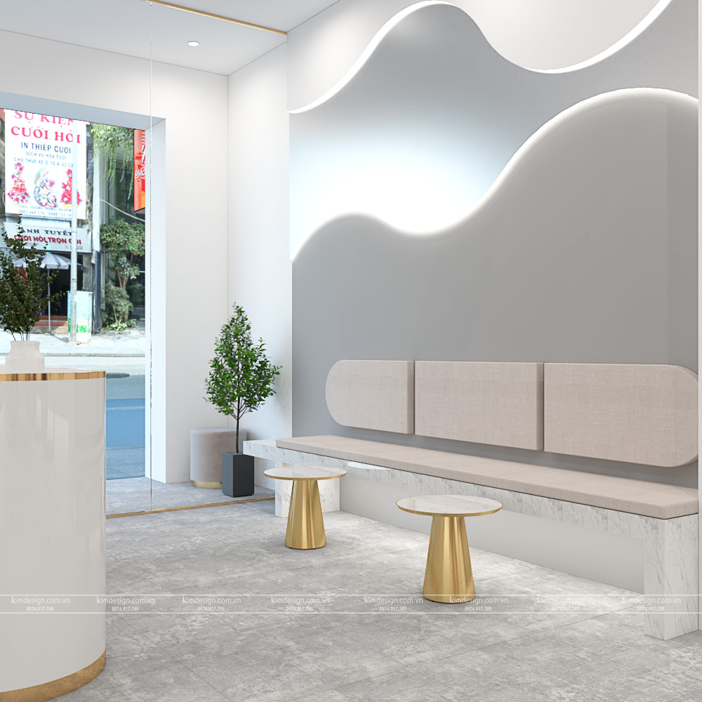 Đối diện quầy thu ngân thiết kế một ghế dài và hai bàn nhỏ để khi khách bước vào salon chờ trải nghiệm dịch vụ. Đây cũng là nơi để bạn tư vấn cho khách hàng những dịch vụ.