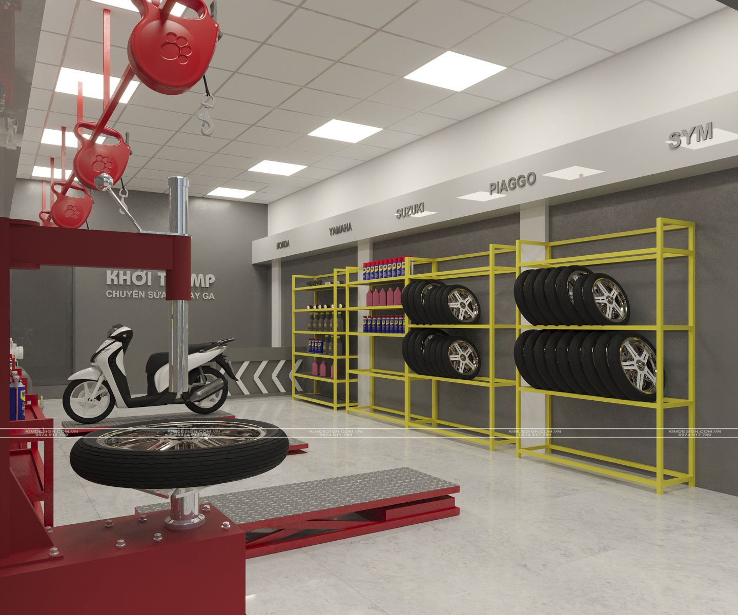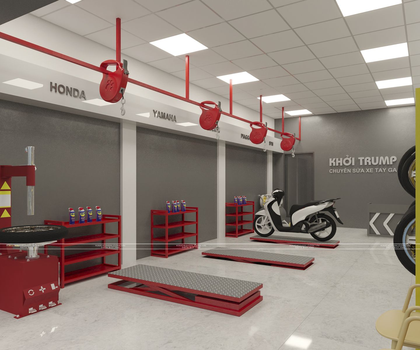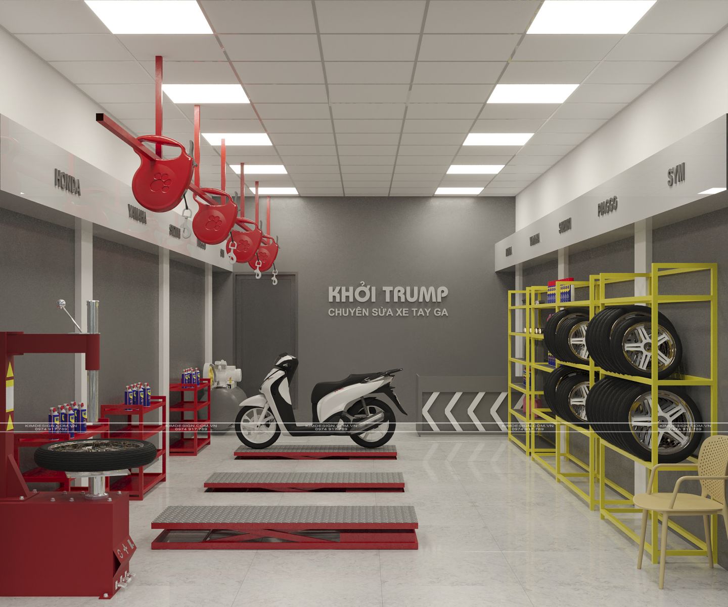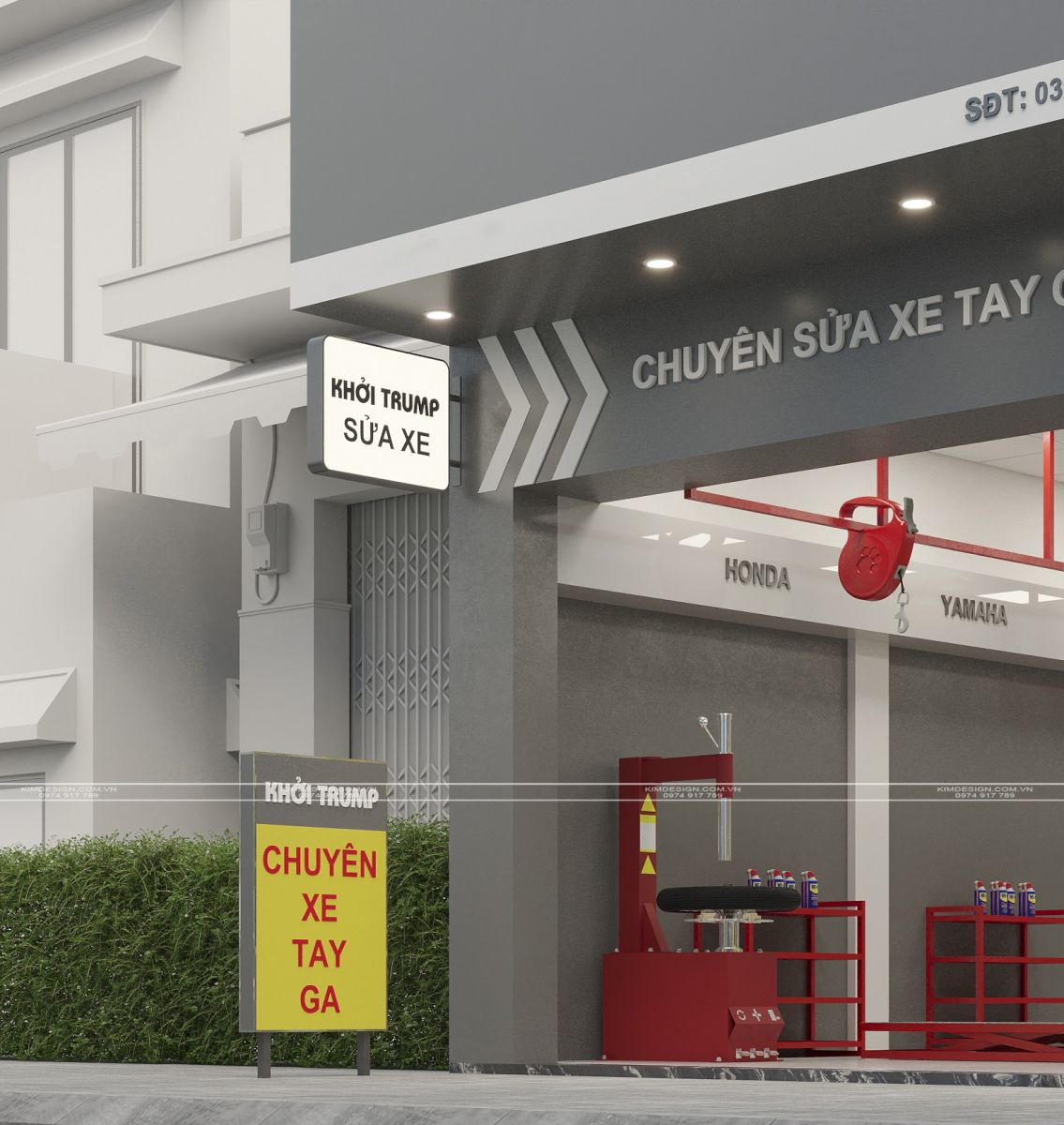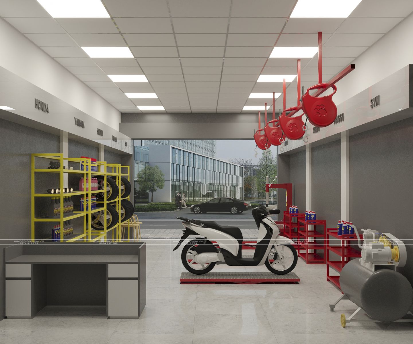 Trong bối cảnh thị trường dịch vụ sửa chữa xe máy ngày càng chuyên nghiệp hóa, việc đầu tư vào một không gian kinh doanh có thiết kế bài bản, hiện đại không chỉ là nâng cao tính thẩm mỹ mà còn là khẳng định chất lượng dịch vụ. Thiết kế cửa hàng sửa chữa xe dưới đây là một minh chứng điển hình cho sự kết hợp hài hòa giữa công năng và vẻ ngoài ấn tượng, tạo nên một thương hiệu dịch vụ đáng tin cậy.