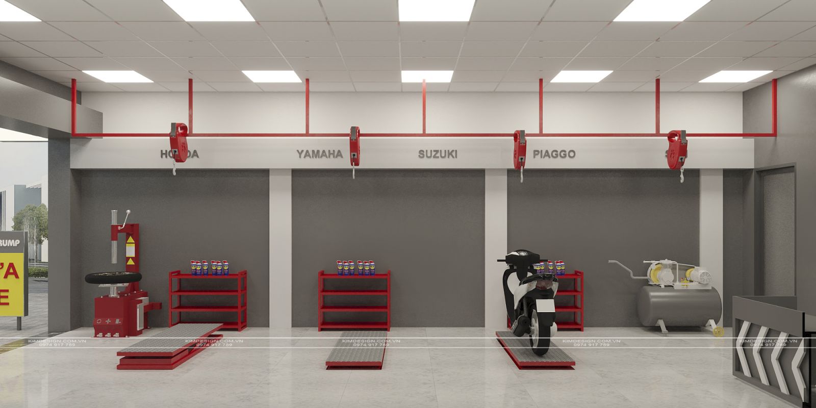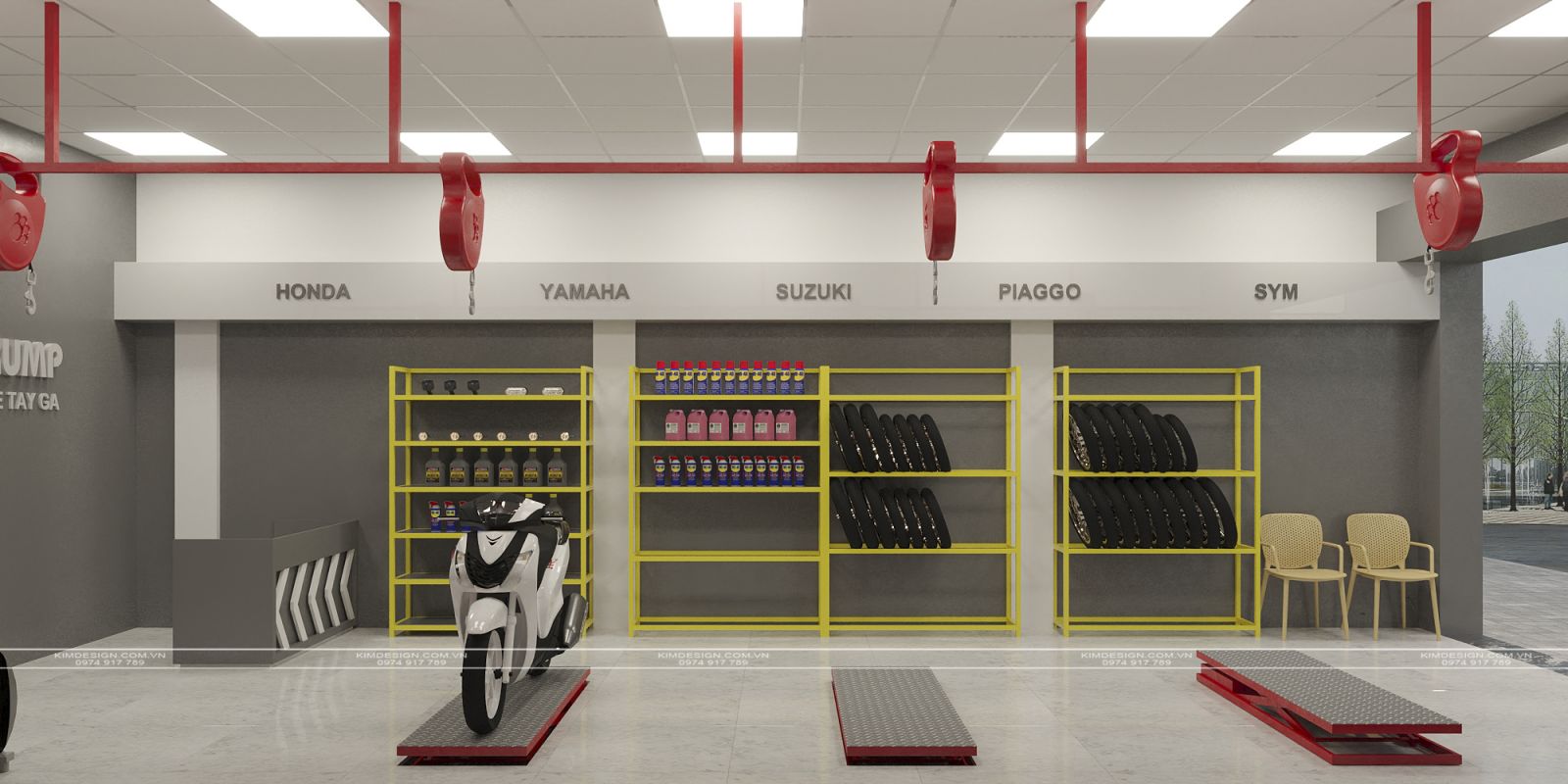 Tóm lại, cửa hàng xe máy này là một mô hình thiết kế cửa hàng dịch vụ xe máy hoàn chỉnh và tiên tiến. Từ việc sử dụng vật liệu công nghiệp hiện đại, đến việc bố trí không gian theo phong cách tối giản, công năng cao, tất cả đã tạo nên một môi trường làm việc chuyên nghiệp, sạch đẹp. Thiết kế này không chỉ nâng cao hiệu suất làm việc mà còn truyền tải thông điệp về chất lượng, sự tin cậy và chuyên môn hóa dịch vụ sửa chữa xe tay ga đến khách hàng. Nhanh tay nhắn tin cho Kim Design để được tư vấn miễn phí nhé!