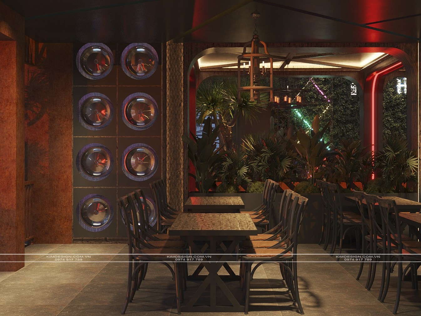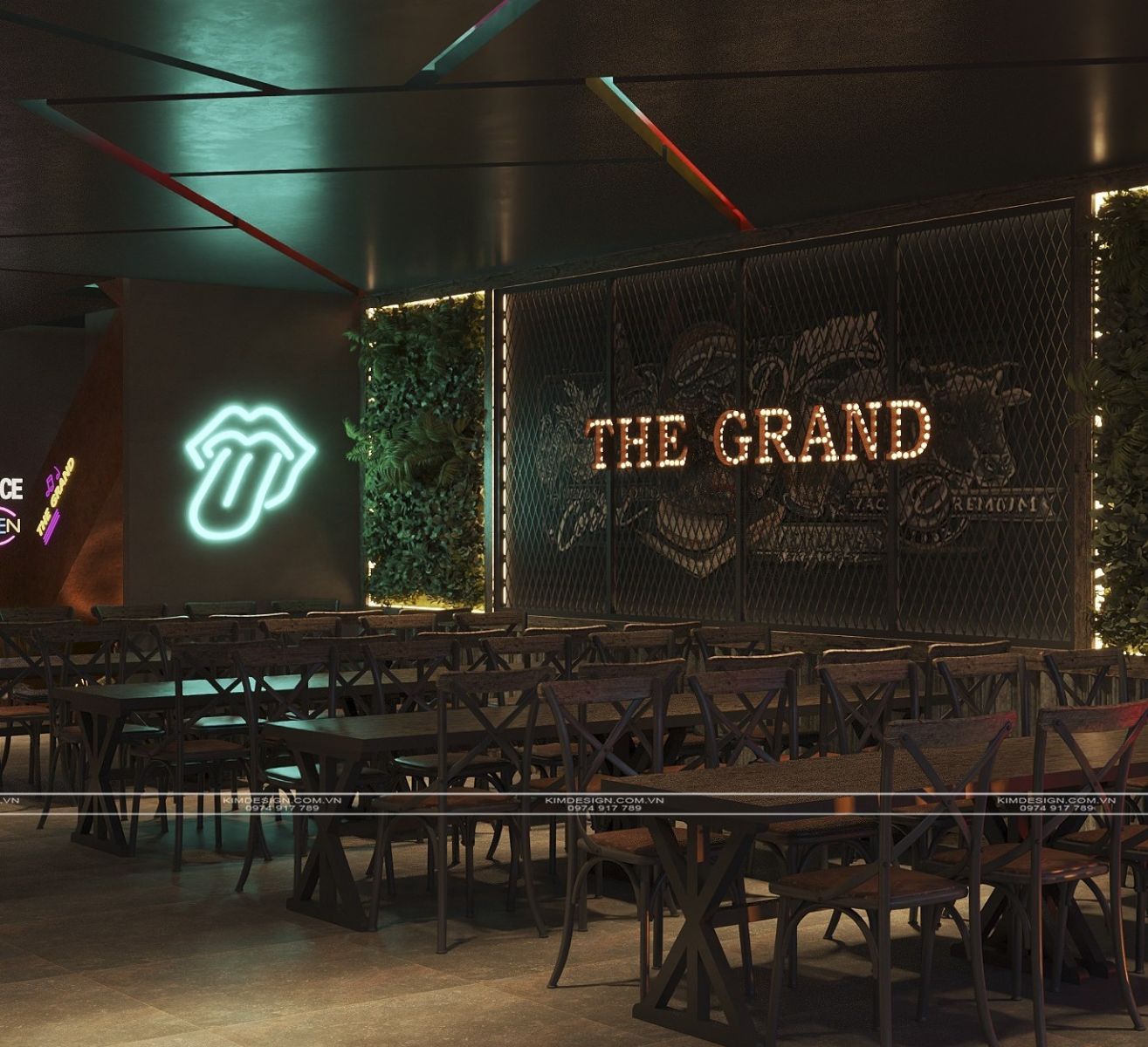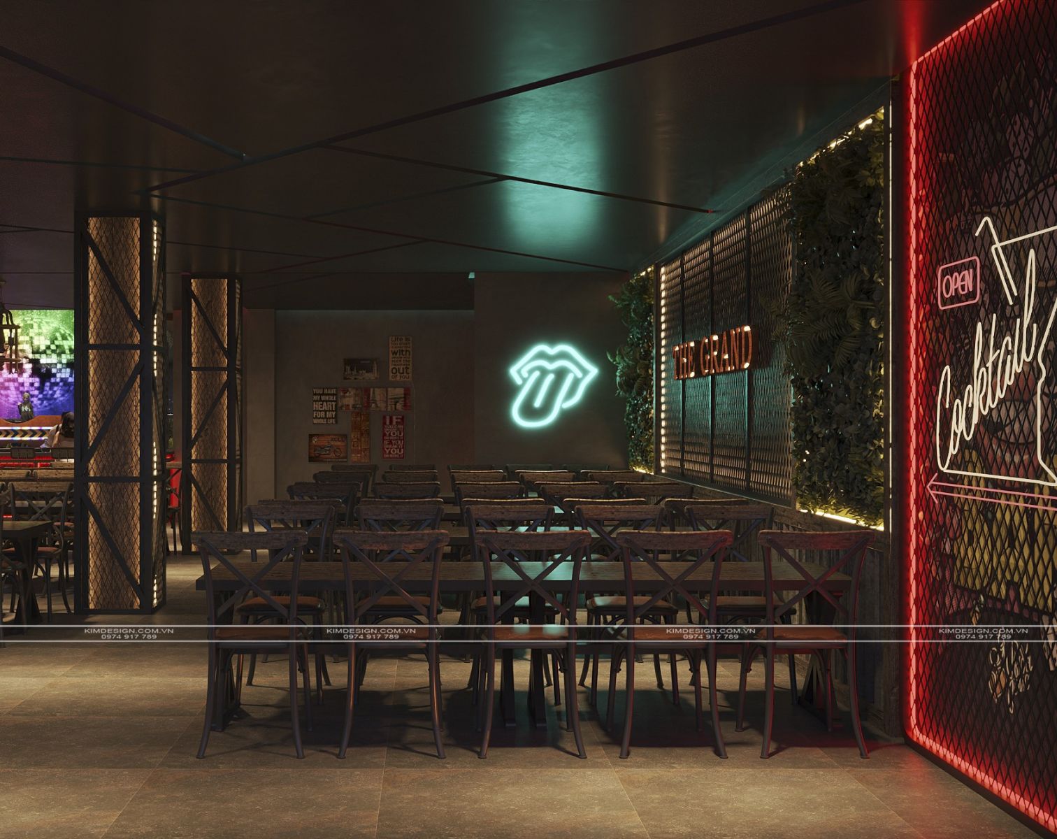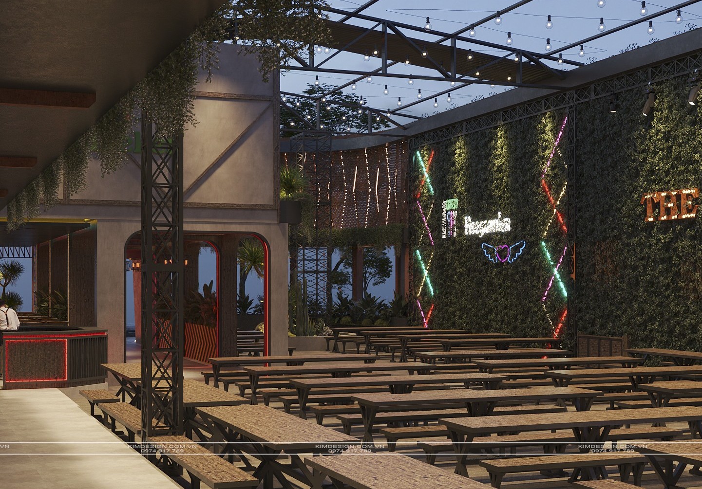 Nchung, mẫu thiết kế nhà hàng này đã thành công trong việc tạo ra một không gian đa chiều, nơi phong cách Industrial mạnh mẽ được nhẹ nhàng hóa một cách khéo léo bằng các yếu tố cây xanh và được thắp sáng rực rỡ bởi hiệu ứng neon hiện đại. Sự kết hợp giữa vật liệu thô mộc, bố cục mở linh hoạt, và hệ thống ánh sáng chuyên nghiệp đã biến nơi đây từ một không gian ẩm thực thông thường thành một điểm đến giải trí đích thực, giàu tính thẩm mỹ và cảm xúc. Thiết kế này không chỉ đáp ứng nhu cầu ăn uống mà còn kiến tạo nên một trải nghiệm thị giác và không khí lễ hội sôi động, khẳng định đây sẽ là một địa điểm thu hút và giữ chân khách hàng trong thời gian dài. Nếu bạn cũng muốn sở hữu cho mình một địa điểm kinh doanh hoành tráng như thế, liên hệ ngay cho Kim Design để được tư vấn miễn phí nhé!