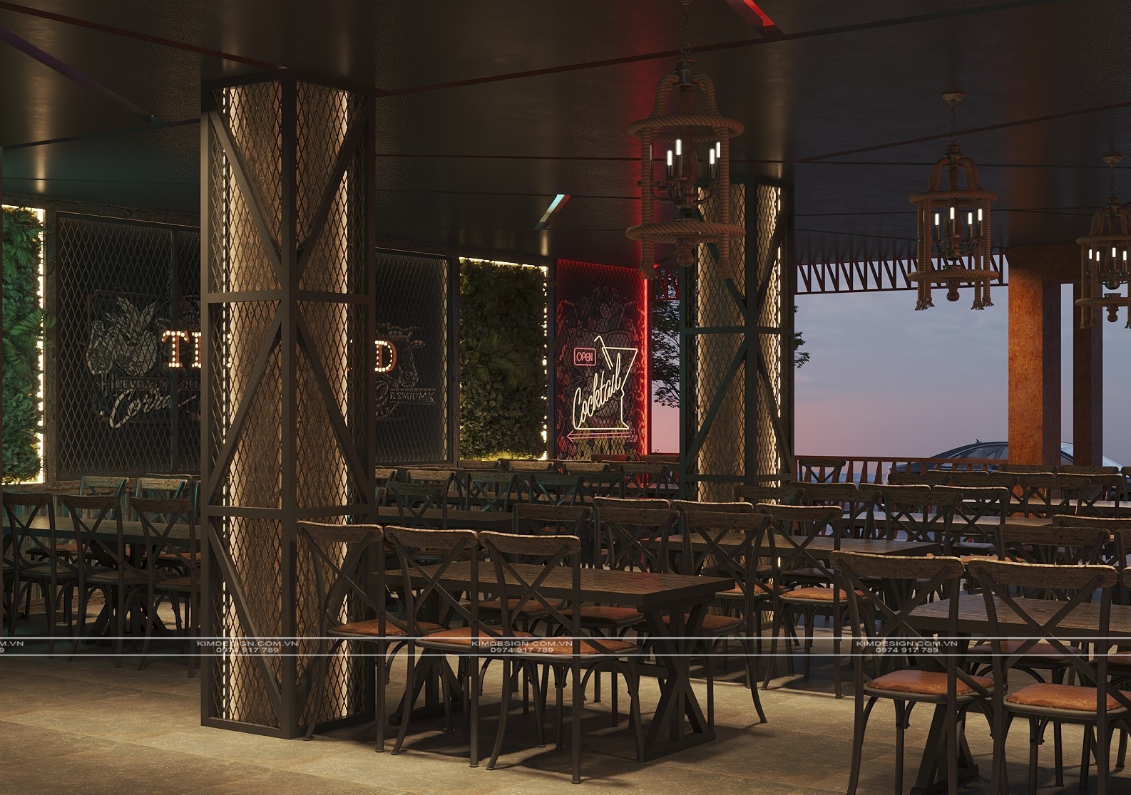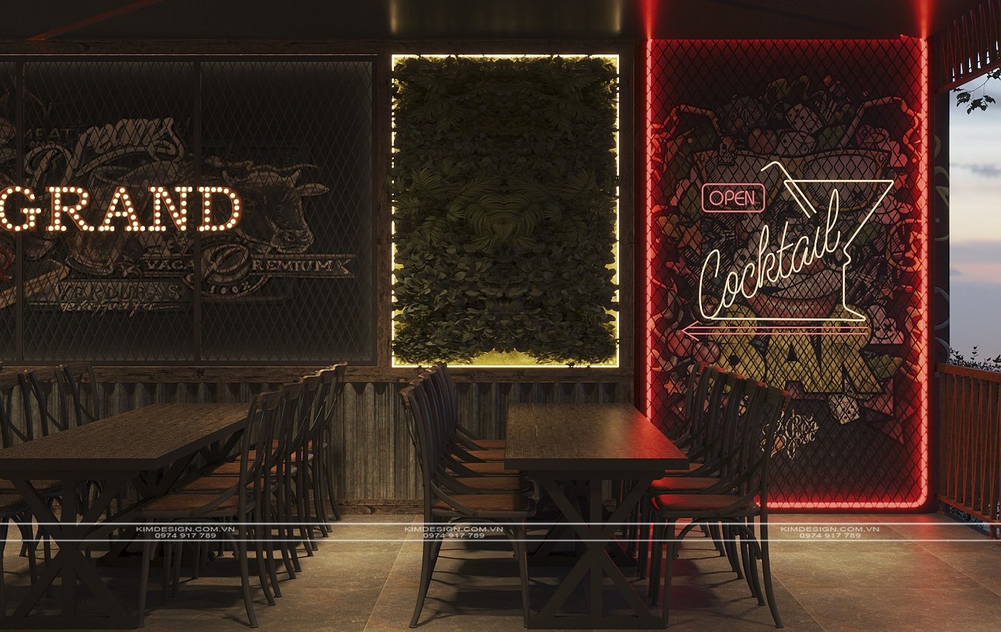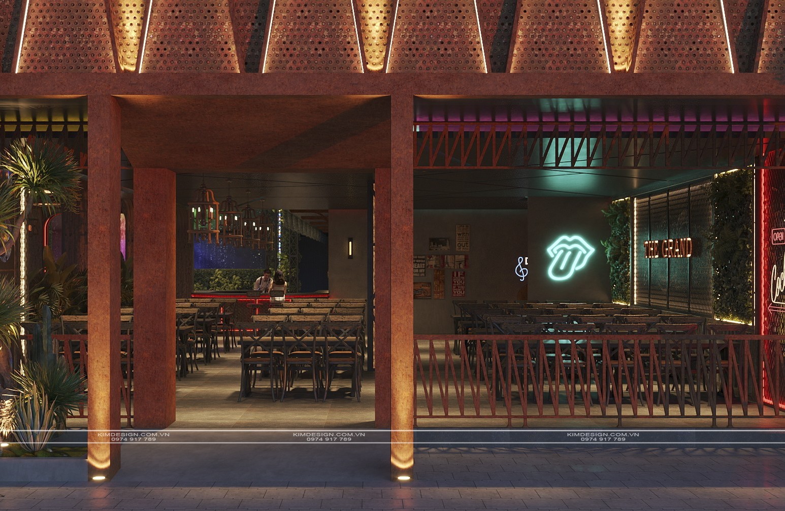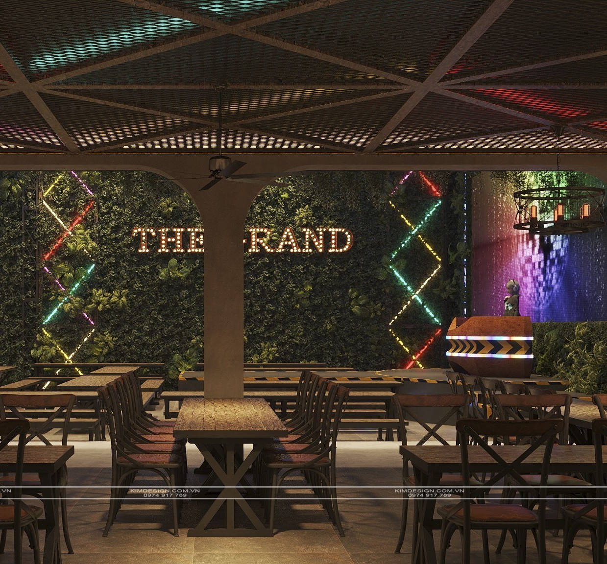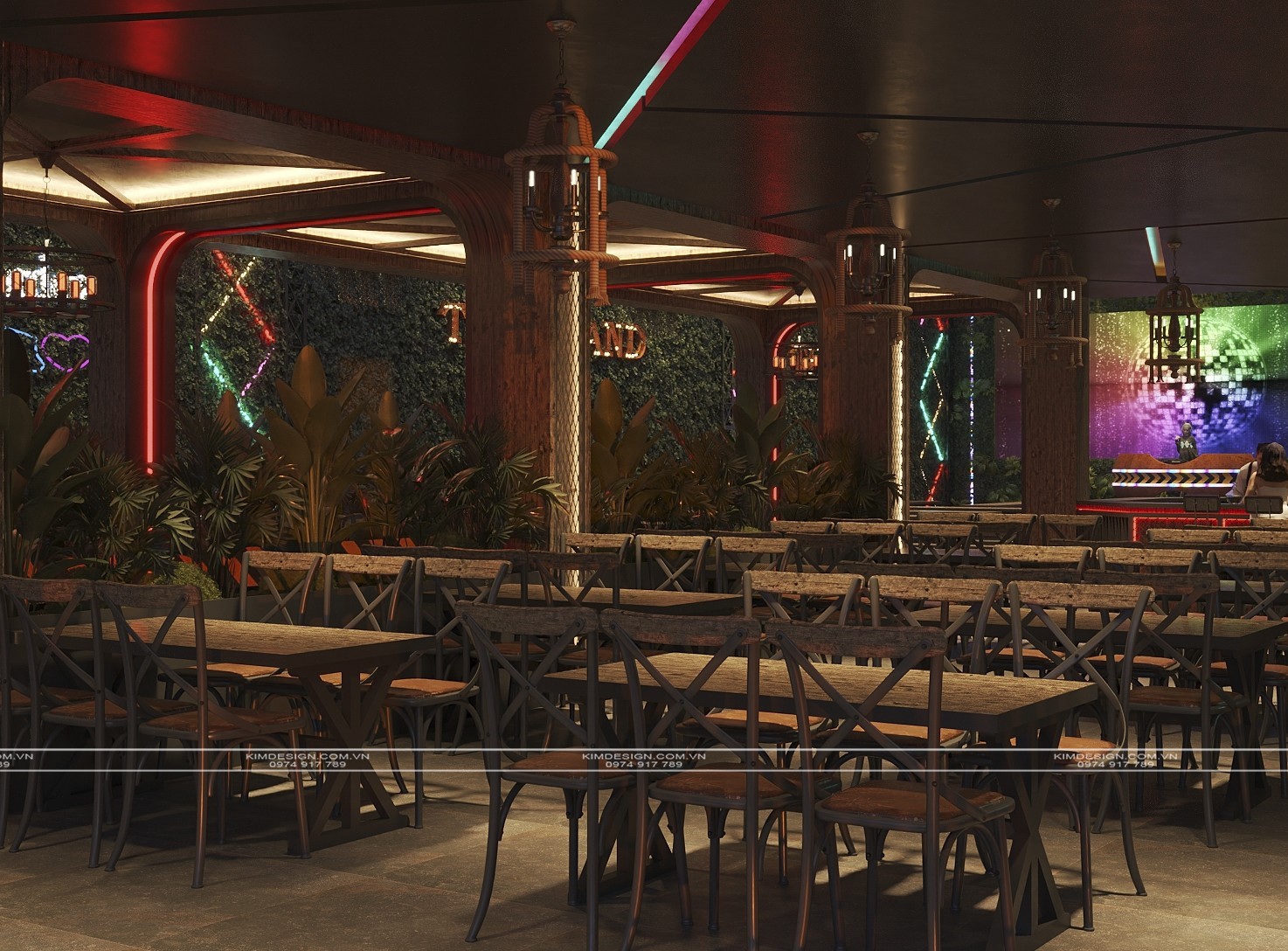 Nchung, mẫu thiết kế nhà hàng này đã thành công trong việc tạo ra một không gian đa chiều, nơi phong cách Industrial mạnh mẽ được nhẹ nhàng hóa một cách khéo léo bằng các yếu tố cây xanh và được thắp sáng rực rỡ bởi hiệu ứng neon hiện đại. Sự kết hợp giữa vật liệu thô mộc, bố cục mở linh hoạt, và hệ thống ánh sáng chuyên nghiệp đã biến nơi đây từ một không gian ẩm thực thông thường thành một điểm đến giải trí đích thực, giàu tính thẩm mỹ và cảm xúc. Thiết kế này không chỉ đáp ứng nhu cầu ăn uống mà còn kiến tạo nên một trải nghiệm thị giác và không khí lễ hội sôi động, khẳng định đây sẽ là một địa điểm thu hút và giữ chân khách hàng trong thời gian dài. Nếu bạn cũng muốn sở hữu cho mình một địa điểm kinh doanh hoành tráng như thế, liên hệ ngay cho Kim Design để được tư vấn miễn phí nhé!