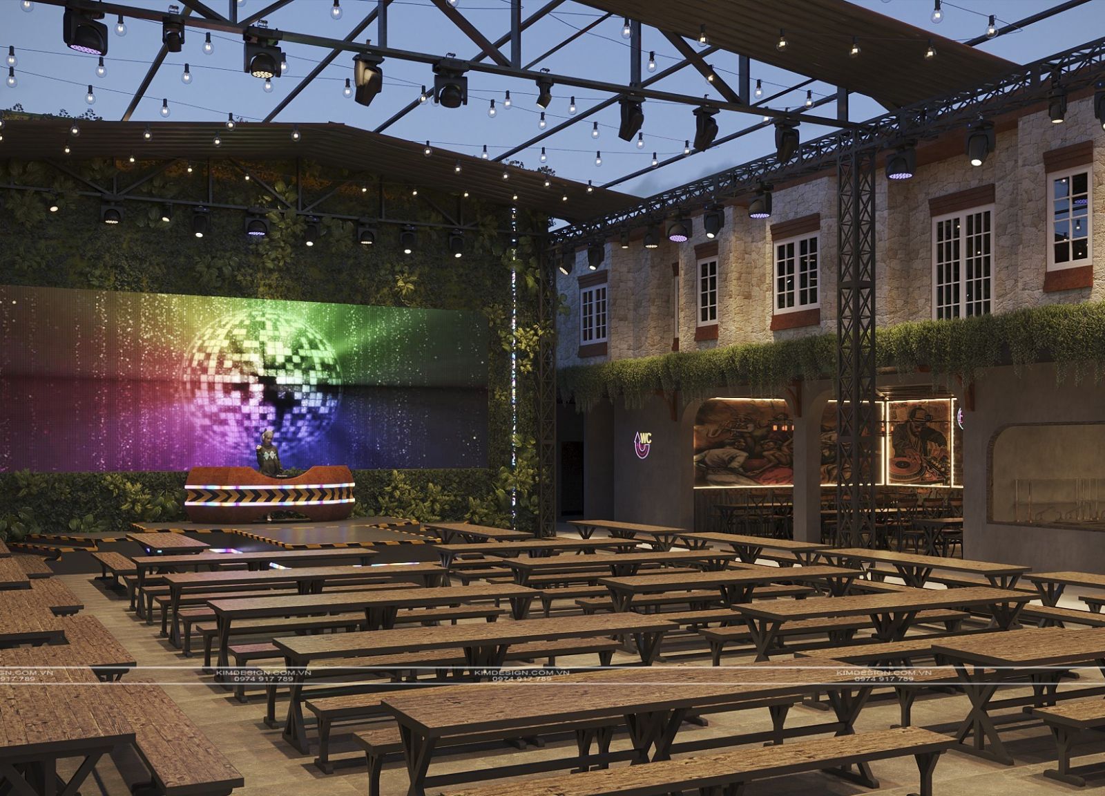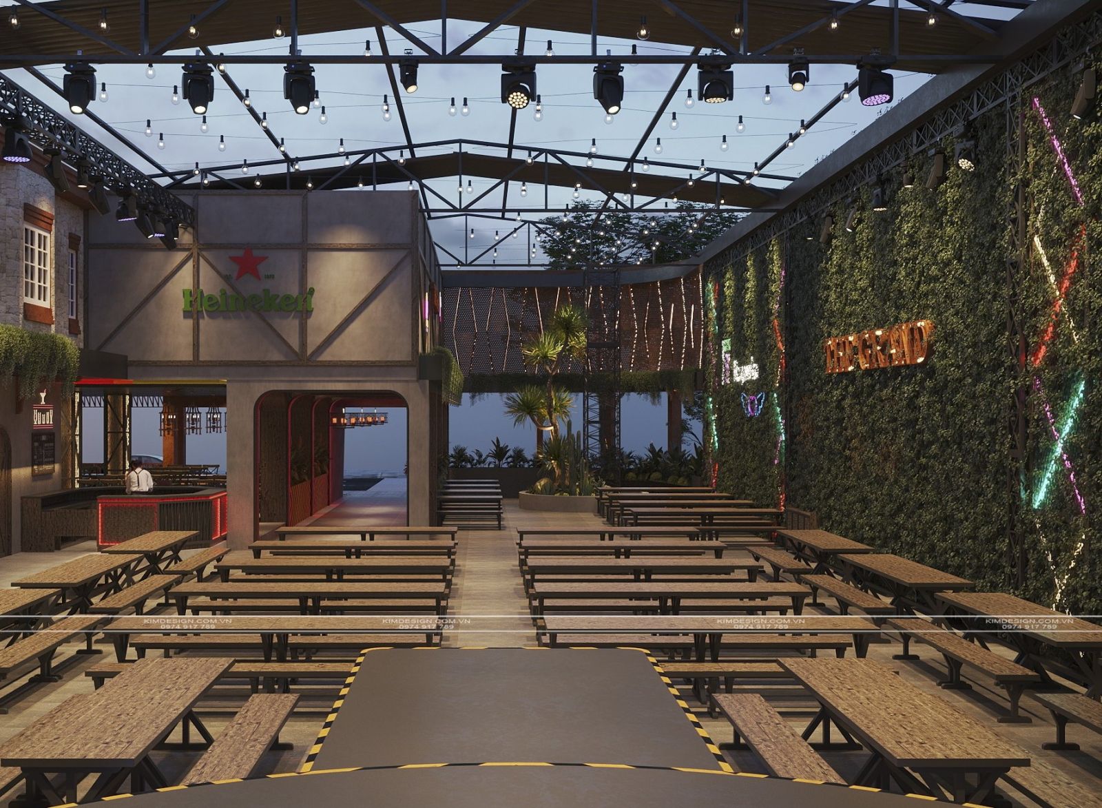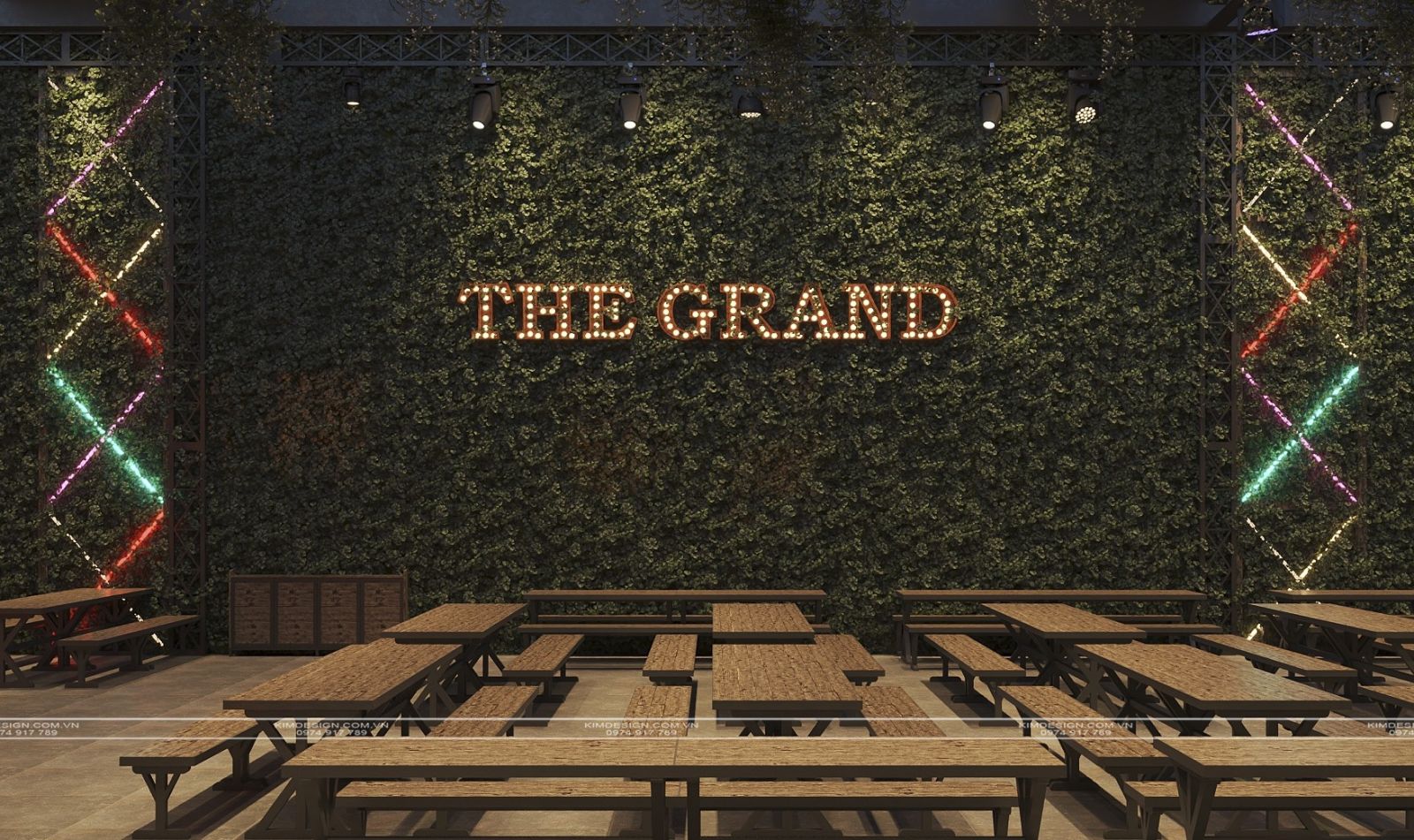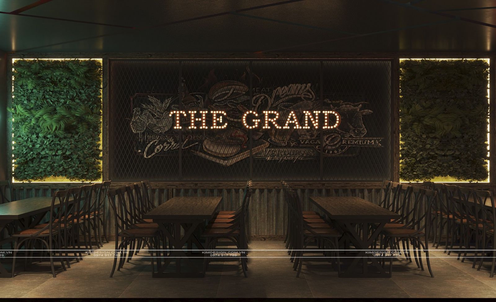 Nchung, mẫu thiết kế nhà hàng này đã thành công trong việc tạo ra một không gian đa chiều, nơi phong cách Industrial mạnh mẽ được nhẹ nhàng hóa một cách khéo léo bằng các yếu tố cây xanh và được thắp sáng rực rỡ bởi hiệu ứng neon hiện đại. Sự kết hợp giữa vật liệu thô mộc, bố cục mở linh hoạt, và hệ thống ánh sáng chuyên nghiệp đã biến nơi đây từ một không gian ẩm thực thông thường thành một điểm đến giải trí đích thực, giàu tính thẩm mỹ và cảm xúc. Thiết kế này không chỉ đáp ứng nhu cầu ăn uống mà còn kiến tạo nên một trải nghiệm thị giác và không khí lễ hội sôi động, khẳng định đây sẽ là một địa điểm thu hút và giữ chân khách hàng trong thời gian dài. Nếu bạn cũng muốn sở hữu cho mình một địa điểm kinh doanh hoành tráng như thế, liên hệ ngay cho Kim Design để được tư vấn miễn phí nhé!