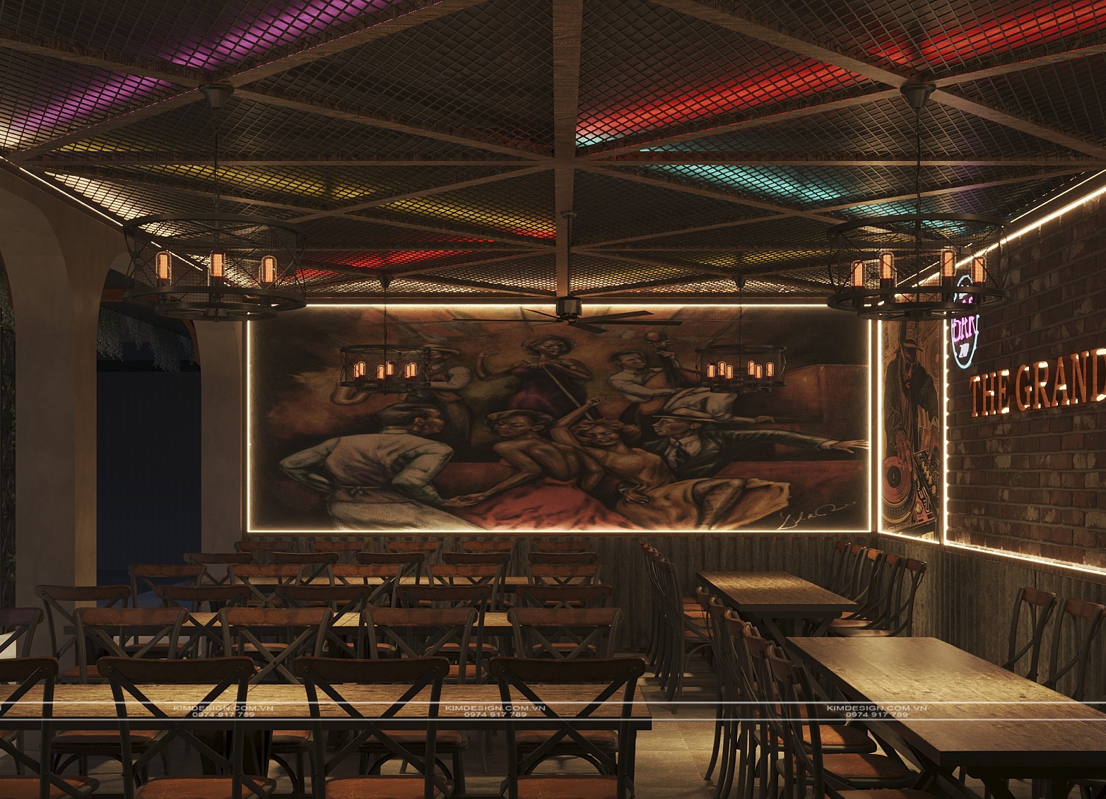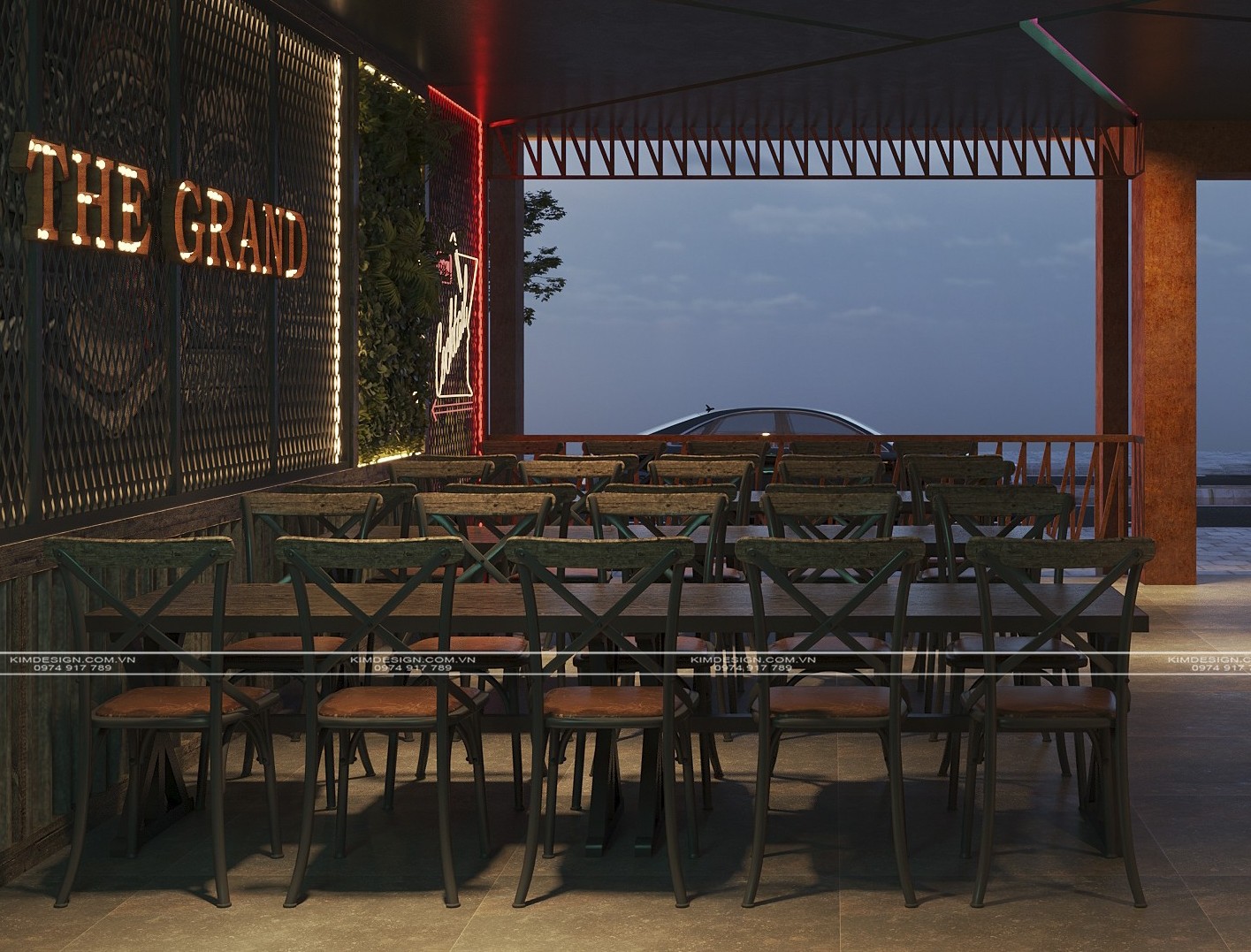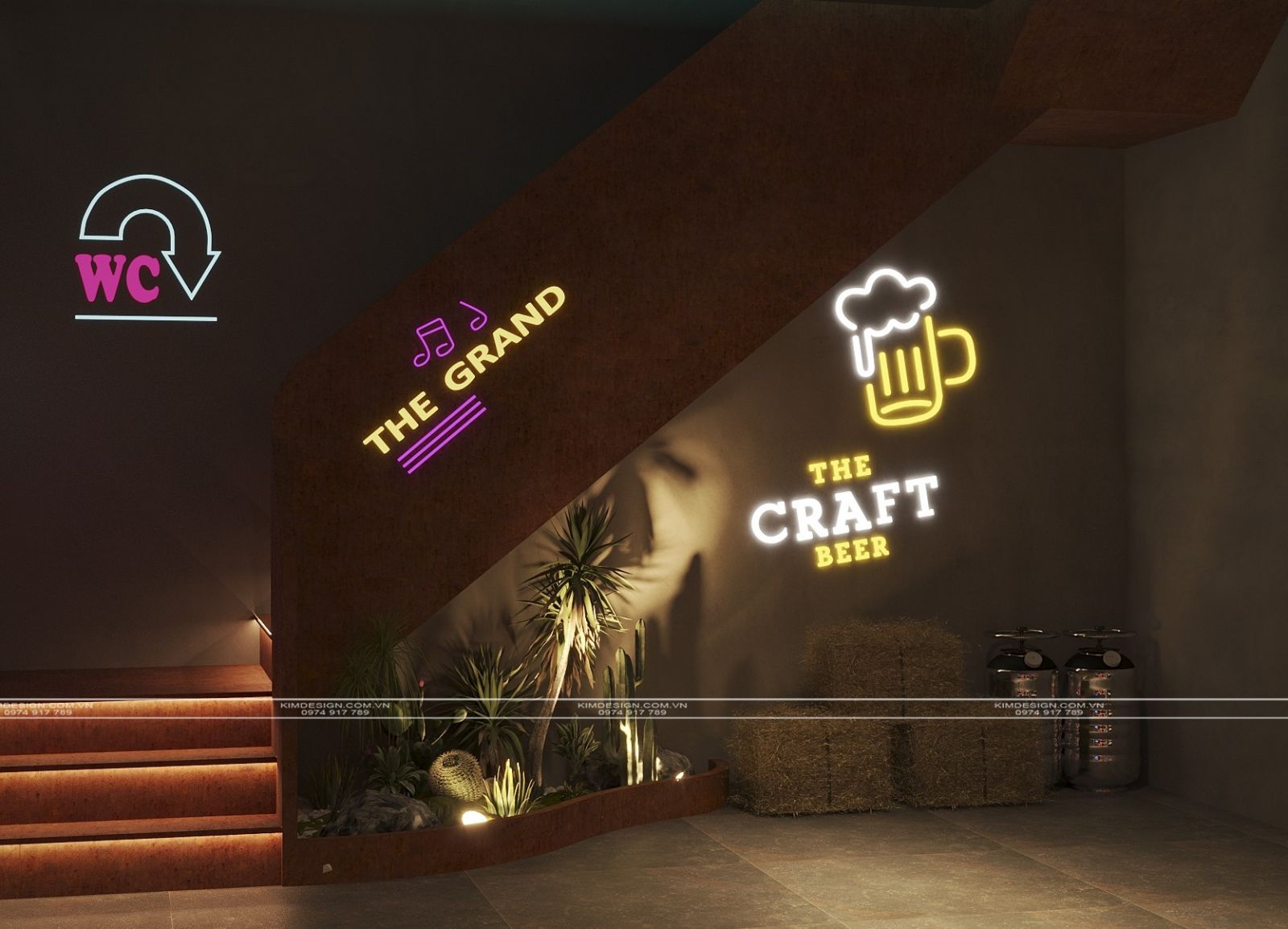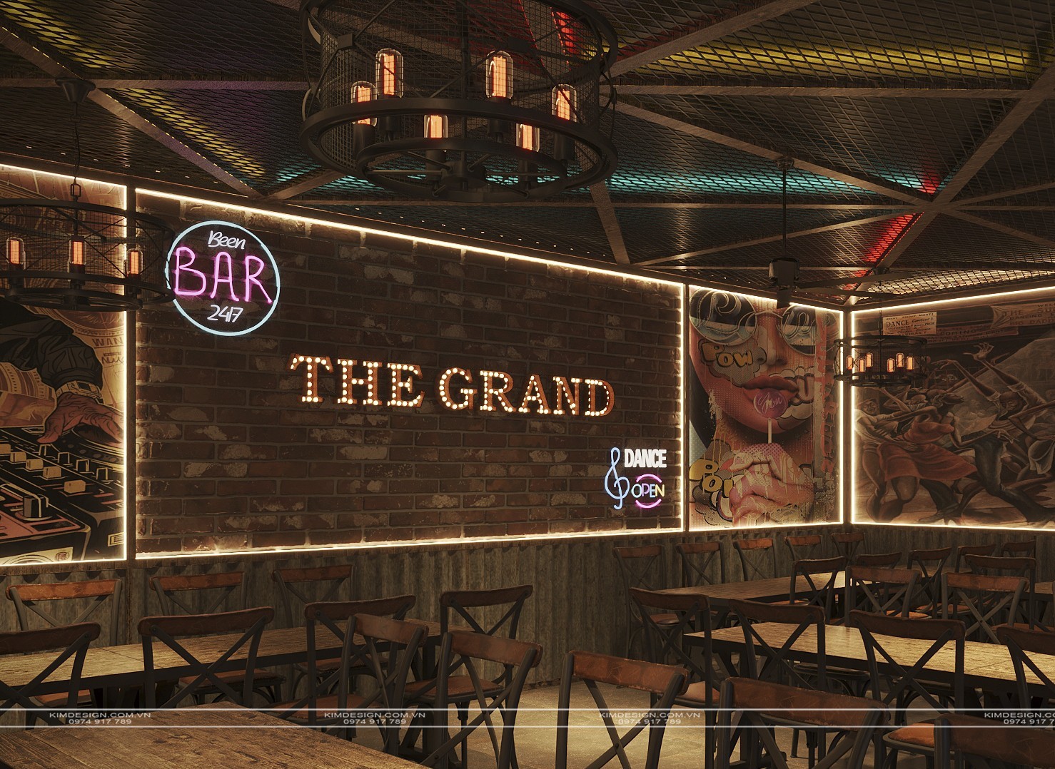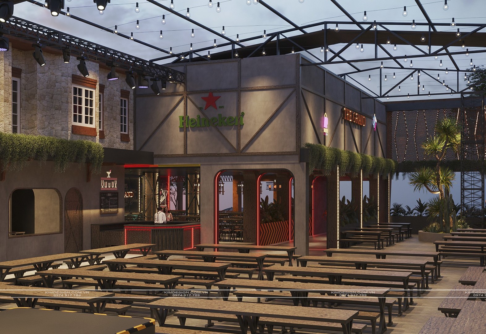 Nchung, mẫu thiết kế nhà hàng này đã thành công trong việc tạo ra một không gian đa chiều, nơi phong cách Industrial mạnh mẽ được nhẹ nhàng hóa một cách khéo léo bằng các yếu tố cây xanh và được thắp sáng rực rỡ bởi hiệu ứng neon hiện đại. Sự kết hợp giữa vật liệu thô mộc, bố cục mở linh hoạt, và hệ thống ánh sáng chuyên nghiệp đã biến nơi đây từ một không gian ẩm thực thông thường thành một điểm đến giải trí đích thực, giàu tính thẩm mỹ và cảm xúc. Thiết kế này không chỉ đáp ứng nhu cầu ăn uống mà còn kiến tạo nên một trải nghiệm thị giác và không khí lễ hội sôi động, khẳng định đây sẽ là một địa điểm thu hút và giữ chân khách hàng trong thời gian dài. Nếu bạn cũng muốn sở hữu cho mình một địa điểm kinh doanh hoành tráng như thế, liên hệ ngay cho Kim Design để được tư vấn miễn phí nhé!