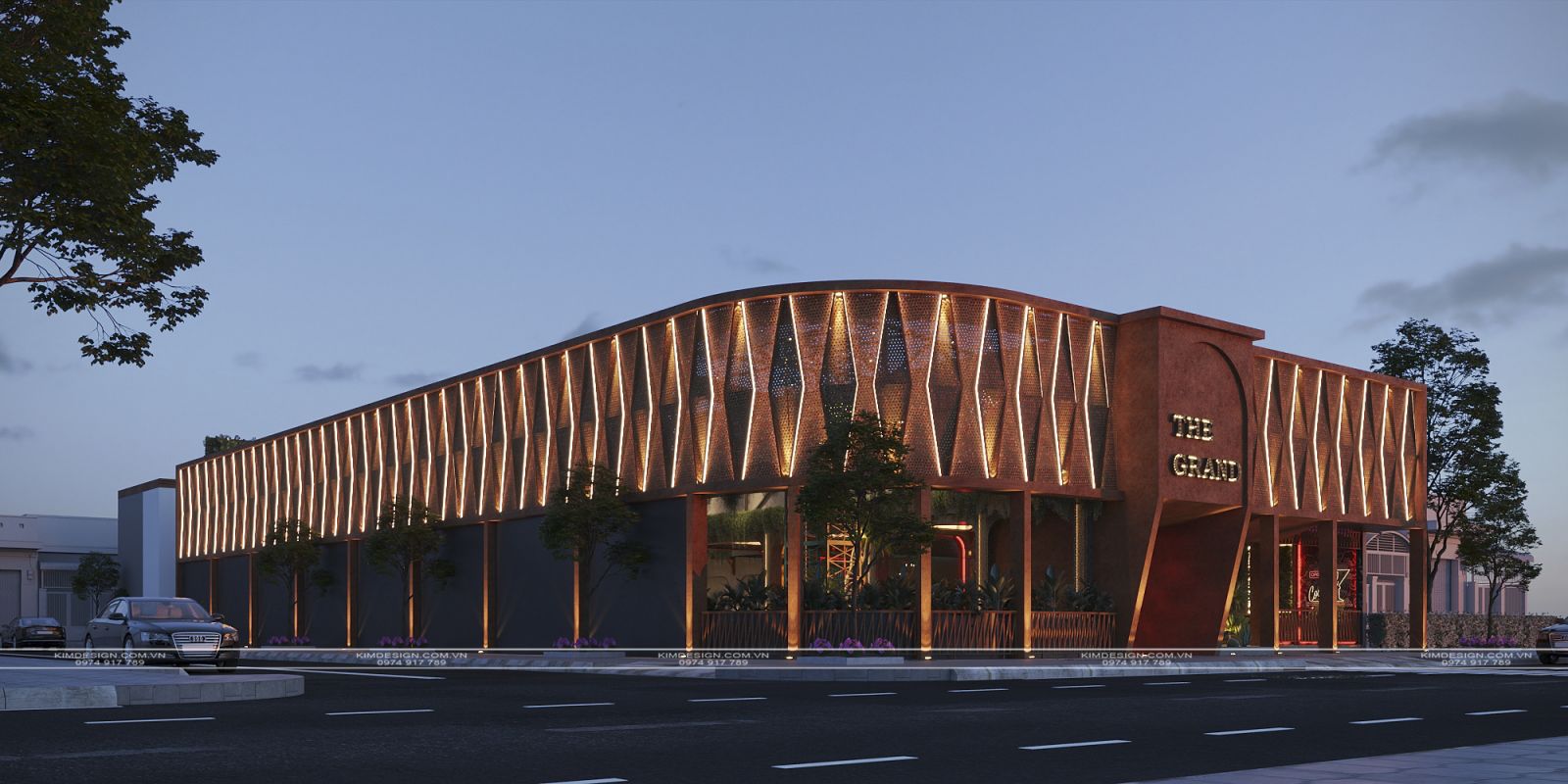Thiết kế mặt tiền của nhà hàng này mang phong cách hiện đại và ấn tượng, nổi bật với việc sử dụng rộng rãi các tấm thép đục lỗ được sơn hiệu ứng gỉ sét màu nâu đỏ. Chất liệu này tạo nên một kết cấu hình học lưới mắt cáo độc đáo, bao bọc phần lớn mặt tiền và mang lại vẻ ngoài vừa mạnh mẽ, vừa có chiều sâu. Sự tương phản được tạo ra giữa màu gỉ sét ấm áp và ánh sáng vàng rực rỡ của các dải đèn LED chạy dọc theo các hình thoi của lưới, đặc biệt nổi bật vào buổi tối. Ở khu vực trung tâm, một khối kiến trúc vuông vắn hơn, cũng cùng tông màu gỉ sét, chứa bảng hiệu chính được đặt trong một khung vòm lớn, tạo điểm nhấn thu hút.