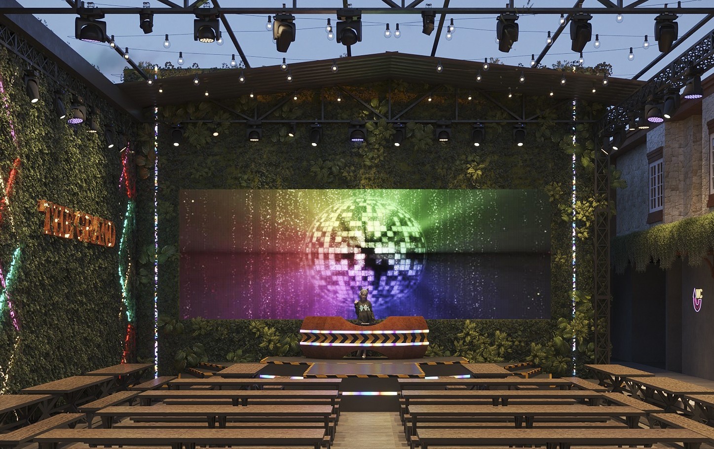 Thiết kế nhà hàng này là sự hòa quyện giữa phong cách công nghiệp mạnh mẽ và hơi thở tự nhiên, kết hợp với yếu tố giải trí sôi động. Không gian được xây dựng trên nền tảng của vật liệu thô mộc, tạo nên một vẻ ngoài gai góc và cá tính. Trái ngược với sự cứng cáp của vật liệu, các mảng tường cây xanh được bố trí xen kẽ, mang lại sự mềm mại, tươi mát và tạo điểm nhấn sinh thái quan trọng, giúp cân bằng thị giác và cảm giác.