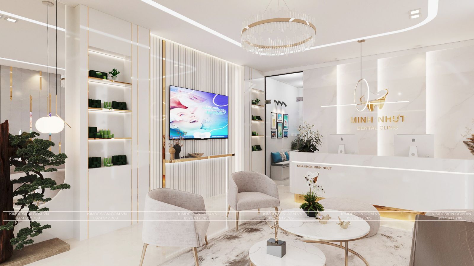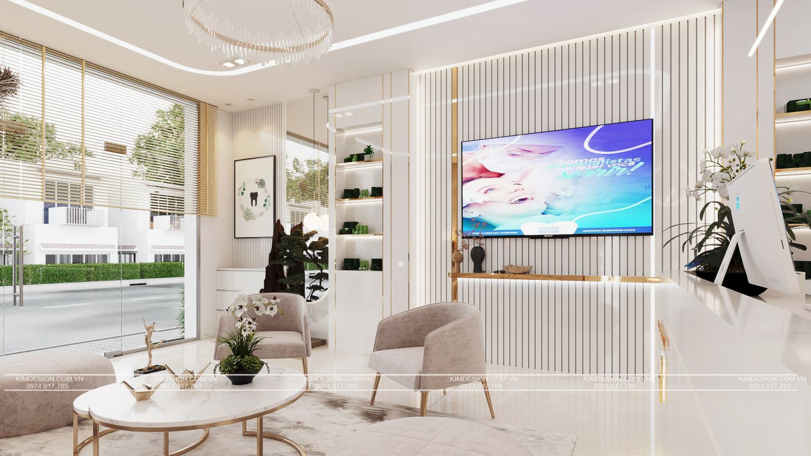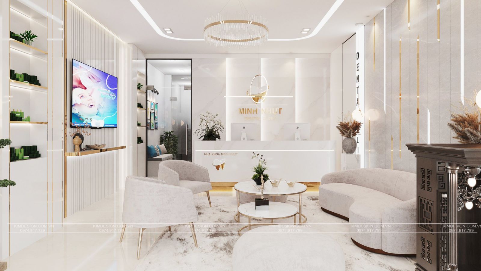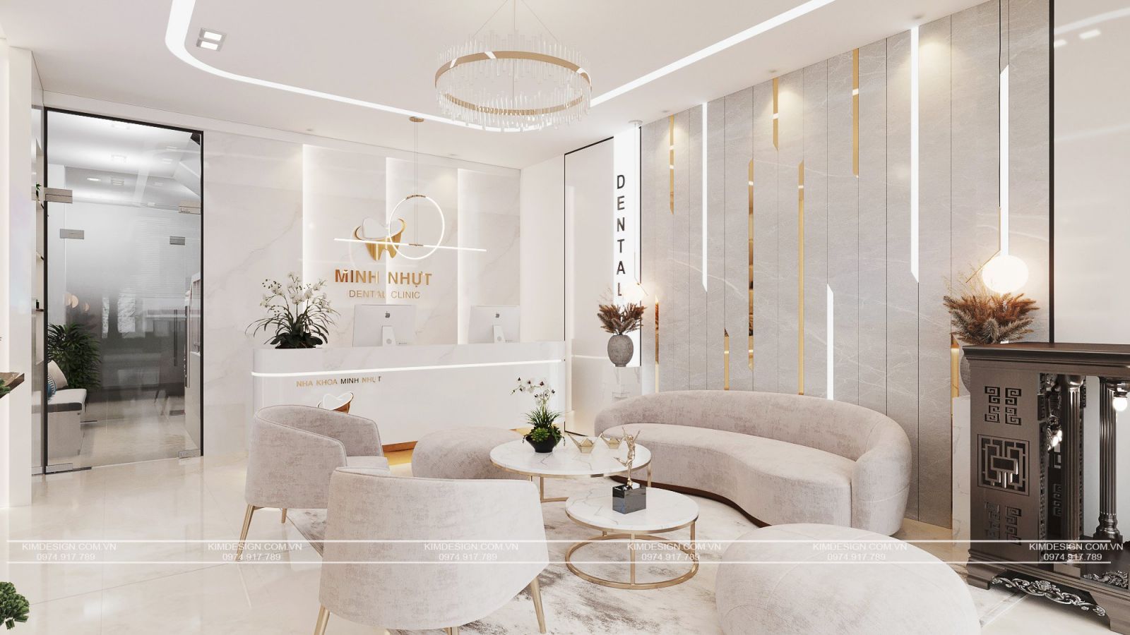 Chính giữa phòng được bố trí một bộ sofa với thiết kế sang trọng, màu sắc hiện đại, kết hợp bàn trà tròn, chân kim loại mạ vàng, sàn nhà được lót thảm làm tăng tính thẩm mỹ. Quầy thu ngân được đặt bên trong sát vách tường. Trên quầy có trang bị trang thiết bị hiện đại phục vụ công tác thanh toán, mặt bàn để thêm chậu hoa tạo điểm nhấn. Vách logo nha khoa được thiết kế phía sau quầy thu ngân, với phông chữ vàng trên nền gạch men, cộng với hệ thống đèn les chiếu sáng trông rất nổi bật.