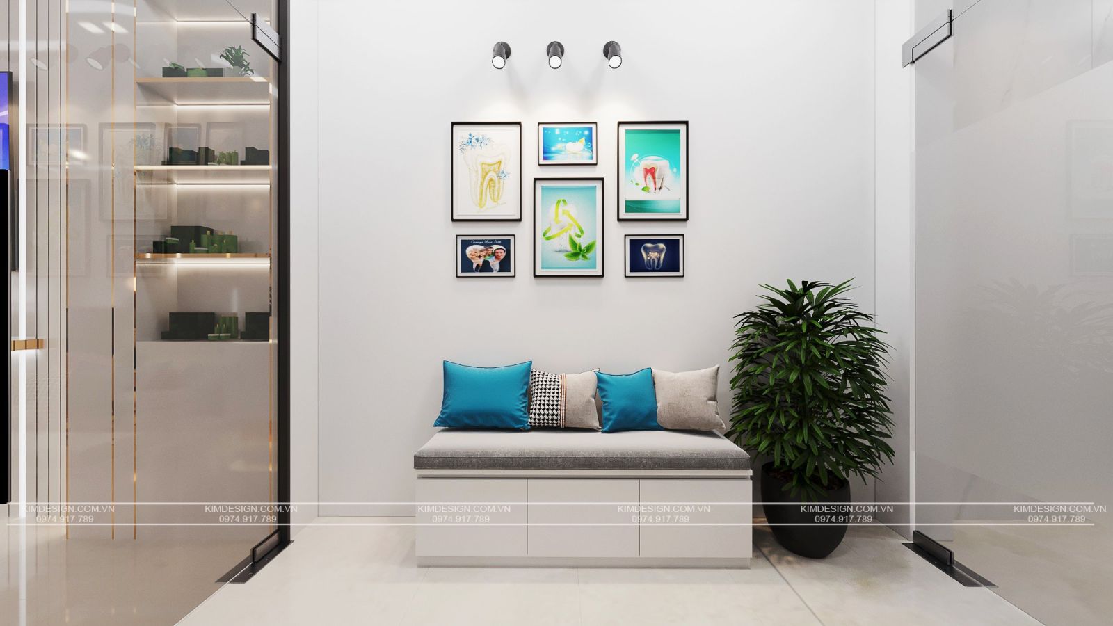 Bên trong là khu vực khách hàng ngồi chờ khám, được thiết kế ghế sofa dài có tựa lưng mềm mại. Trang trí thêm cây xanh và tranh ảnh tạo không gian thư giãn, thoải mái.