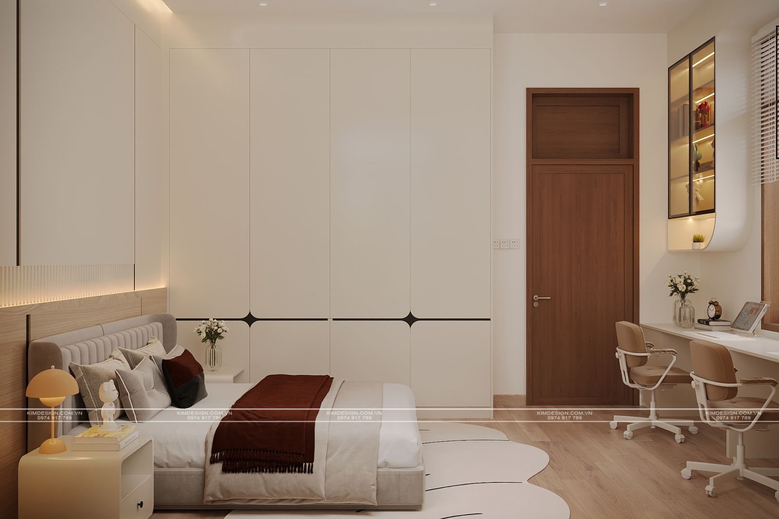 Không gian phòng ngủ hiện lên với ngôn ngữ thiết kế hiện đại, tinh tế, ưu tiên sự tối giản nhưng vẫn toát lên vẻ sang trọng qua cách phối hợp chất liệu và ánh sáng. Bao phủ căn phòng là tông màu kem và trắng chủ đạo, điểm xuyết thêm sắc gỗ ấm áp, tạo nên một tổng thể hài hòa, thư thái.