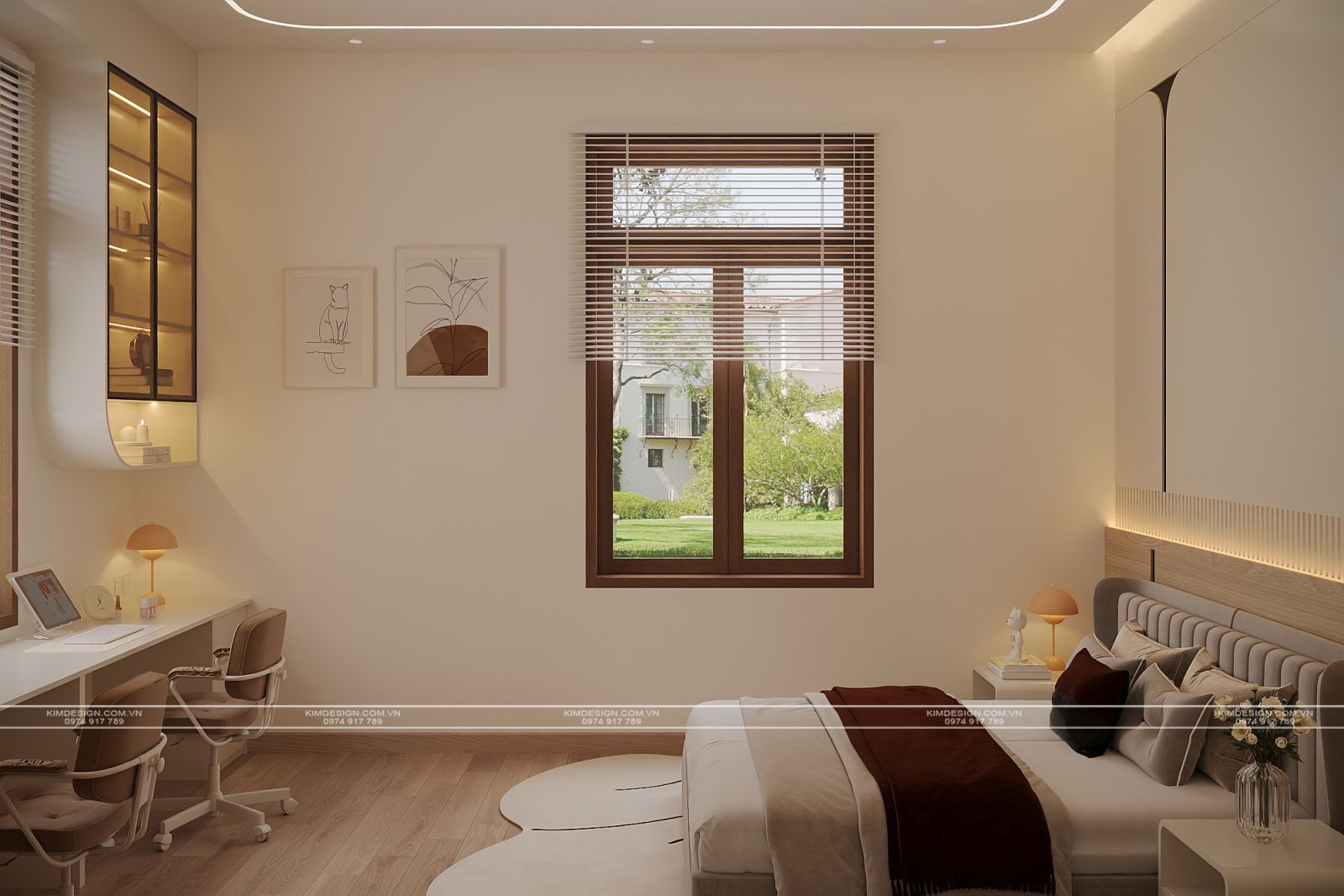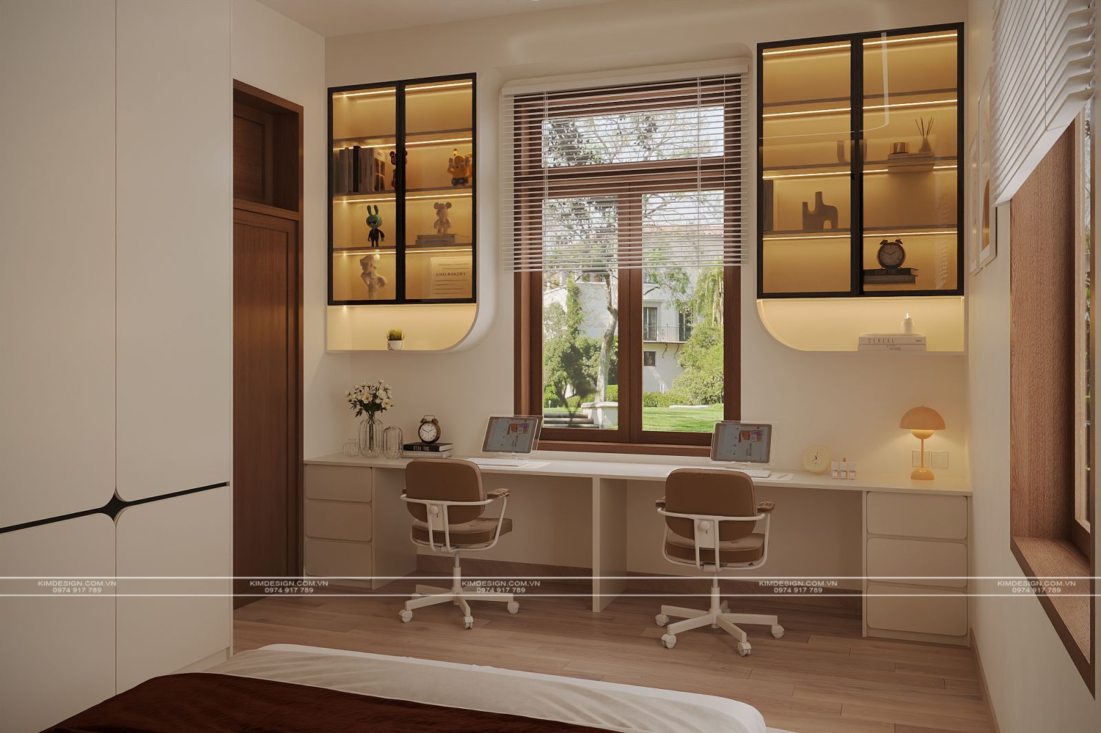 Đối diện và chạy dọc theo chiều dài căn phòng là hệ tủ quần áo kịch trần thiết kế phẳng, không tay nắm, tạo sự đồng nhất với ngôn ngữ thiết kế chung. Nối tiếp đó là bàn làm việc đôi trải dài dưới ô cửa sổ lớn, nơi đón trọn ánh sáng tự nhiên qua lớp rèm sáo gỗ sang trọng. Phía trên bàn làm việc, các hệ tủ trang trí cánh kính viền đen tích hợp đèn led bên trong không chỉ là nơi lưu trữ sách vở, vật dụng mà còn là không gian trưng bày các món đồ decor cá tính, tạo chiều sâu cho góc nhìn.