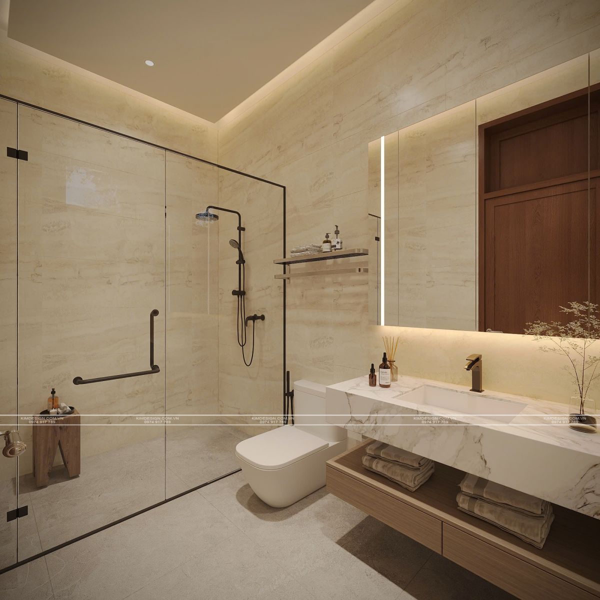 Bước vào khu vực vệ sinh, sự sang trọng tiếp tục được duy trì. Khu vực tắm đứng được ngăn cách bằng vách kính cường lực trong suốt với hệ phụ kiện đen mờ hiện đại, tạo cảm giác thông thoáng và sạch sẽ.Sự kết hợp giữa ánh sáng vàng ấm áp, chất liệu gỗ đã biến căn phòng thành một nơi nghỉ ngơi lý tưởng, đầy đủ tiện nghi và đậm chất nghệ thuật. Nhắn tin ngay cho Kim Design để được tư vấn miễn phí!
