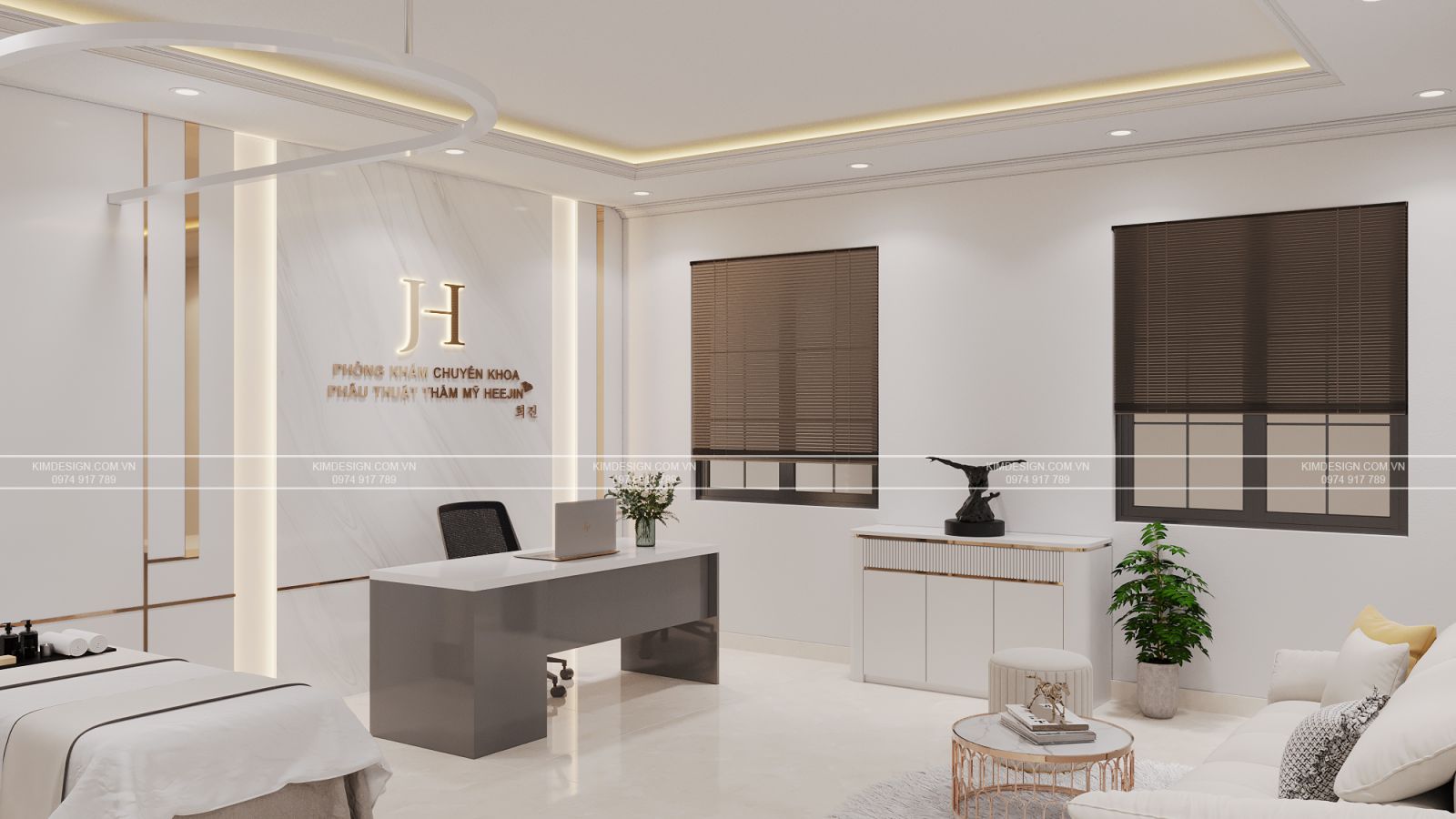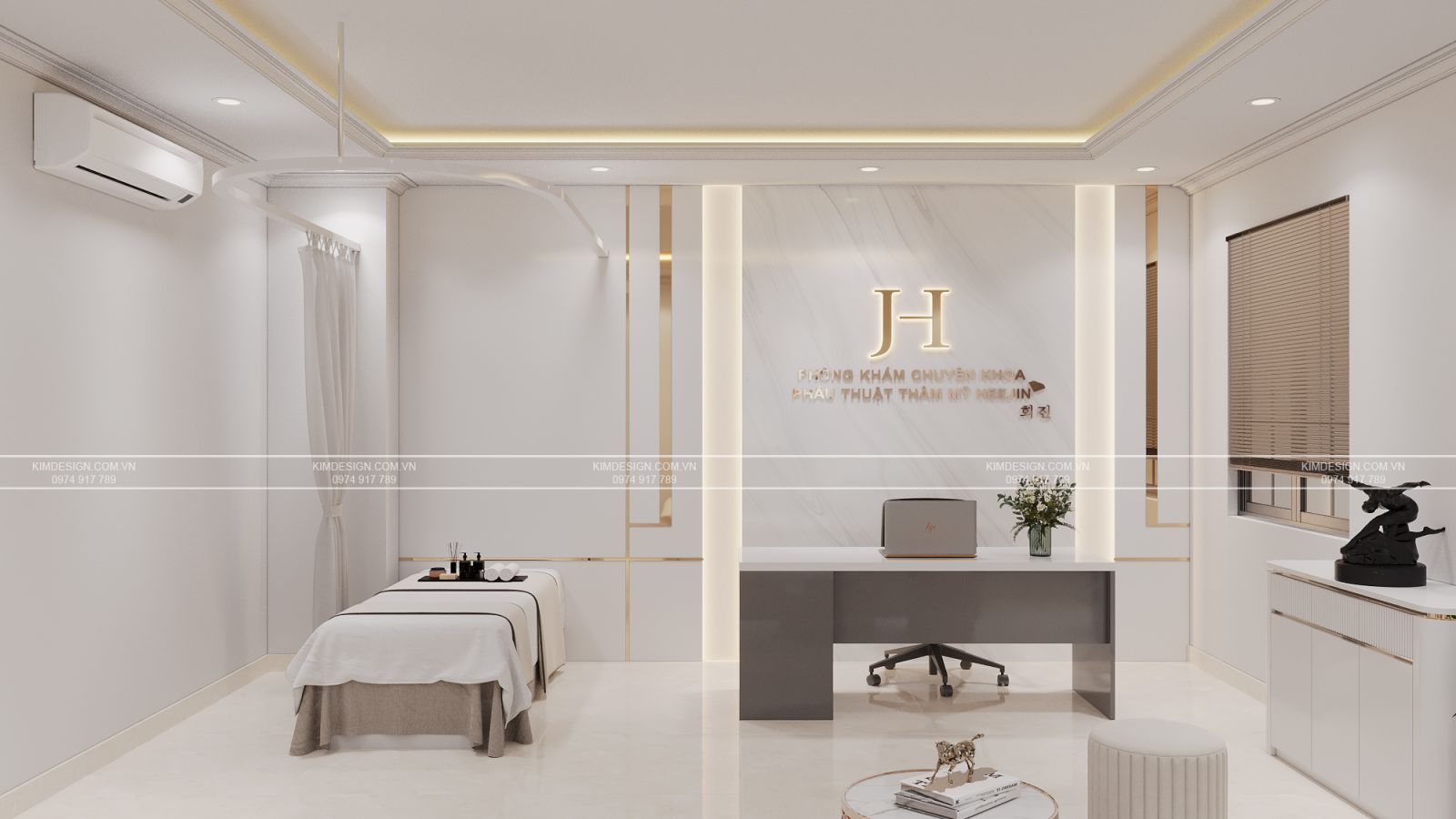 Phía đối diện, khu vực tiếp khách được bố trí một bộ sofa bọc vải màu kem mềm mại, nhấn nhá thêm những chiếc gối tựa, đặt cạnh chiếc bàn trà mặt bàn vân đá, chân inox vàng nghệ thuật. Kế bên được khéo léo đặt một giường khám sạch sẽ, ngăn cách bằng hệ thống rèm treo trên thanh ray uốn cong, đảm bảo sự riêng tư cần thiết. Hai khung cửa sổ nhỏ với rèm sáo nâu hiện đại không chỉ giúp điều tiết ánh sáng tự nhiên mà còn làm không gian thêm phần ấm cúng. Từng chi tiết nội thất đều được sắp đặt tỉ mỉ, tạo nên một không gian tư vấn vừa đẳng cấp, vừa gần gũi đúng chuẩn một spa hiện đại. Nếu bạn cũng đang tìm cho mình một đơn vị có thể mang đến không gian tương tự cho spa của mình, đừng chần chừ gì mà hãy liên hệ với Kim Design ngay hôm nay để có cơ hội sở hữu bản vẽ nội thất đúng gu với ưu đãi miễn phí thiết kế khi thi công trọn gói nhé!