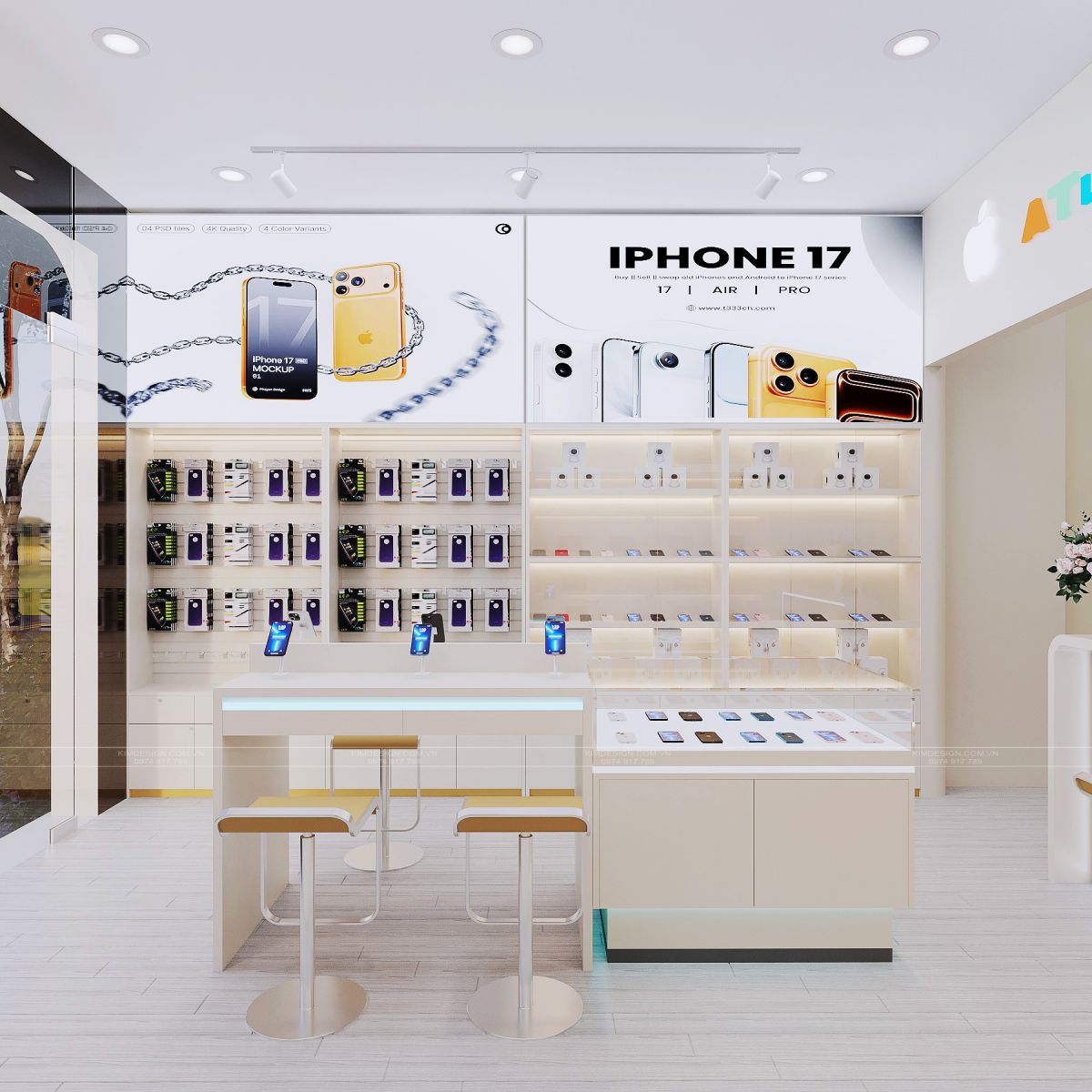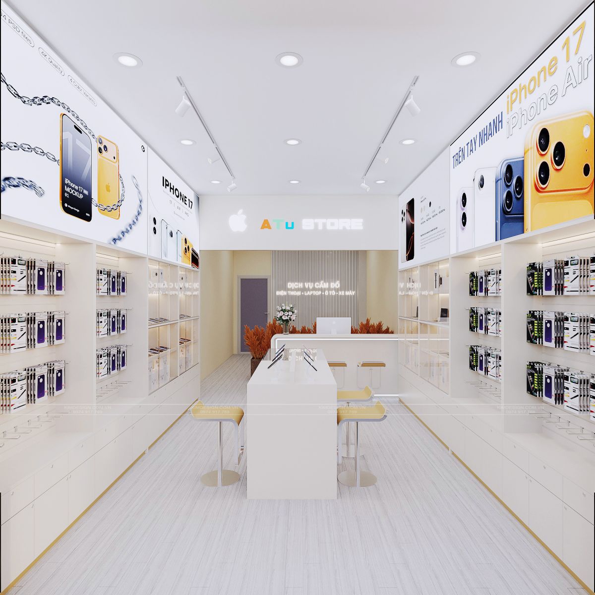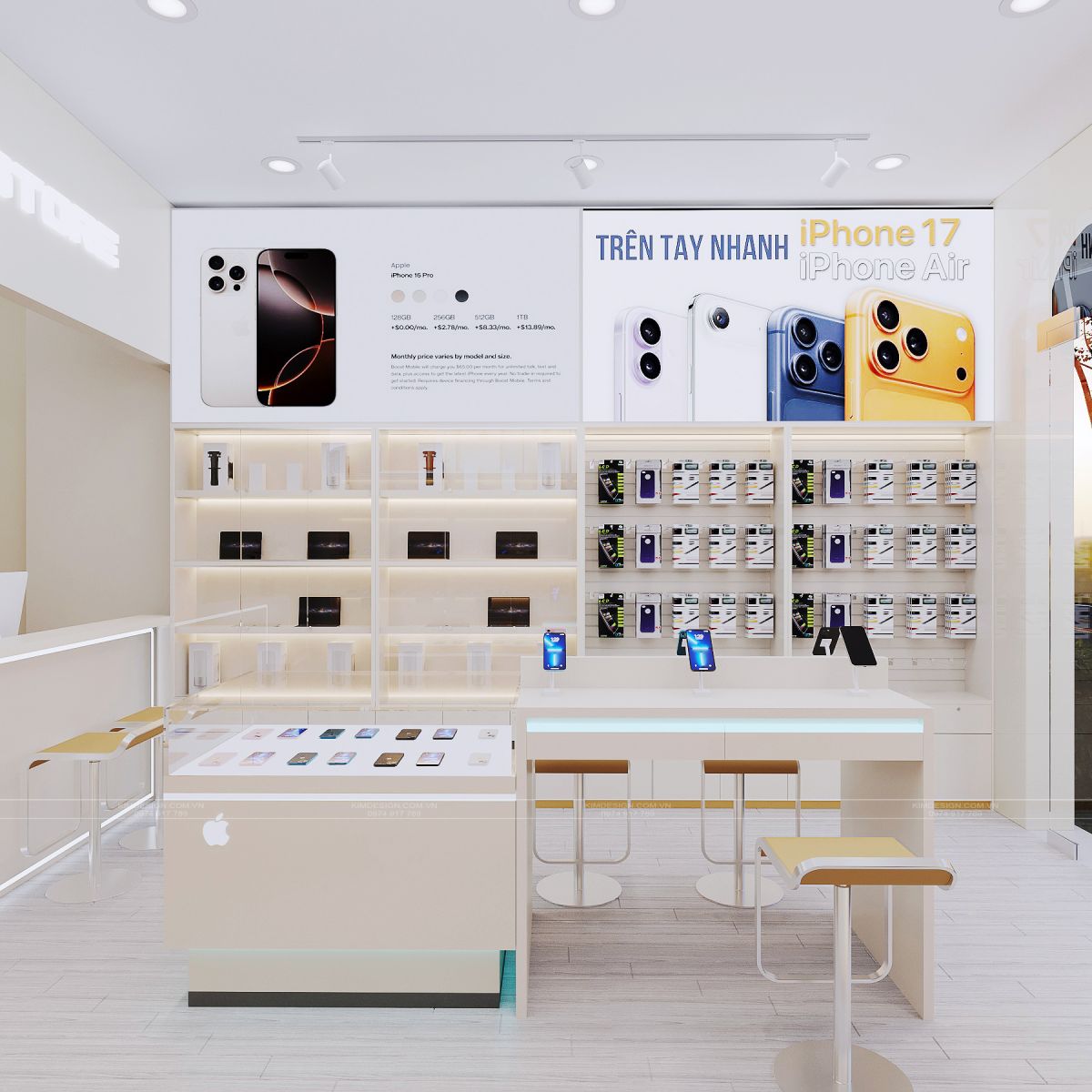 Bản thiết kế này không chỉ là một nơi bày bán đồ công nghệ, mà sự kết hợp giữa ánh sáng, màu sắc và vật liệu đã tạo nên một tổng thể hài hòa, giúp nâng tầm trải nghiệm mua sắm của khách hàng lên một tầm cao mới. Bạn có yêu thích ý tưởng thiết kế shop điện thoại này không, liên hệ ngay với Kim Design để được tư vấn thiết kế hoàn toàn miễn phí nhé!