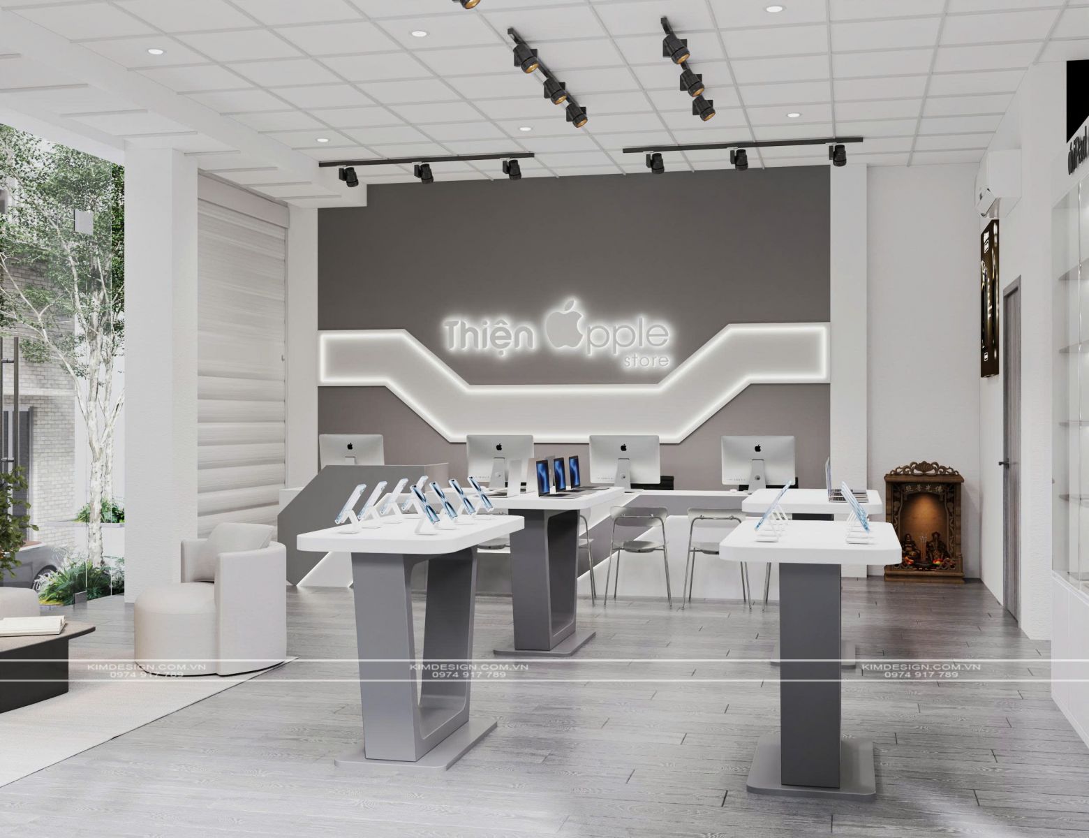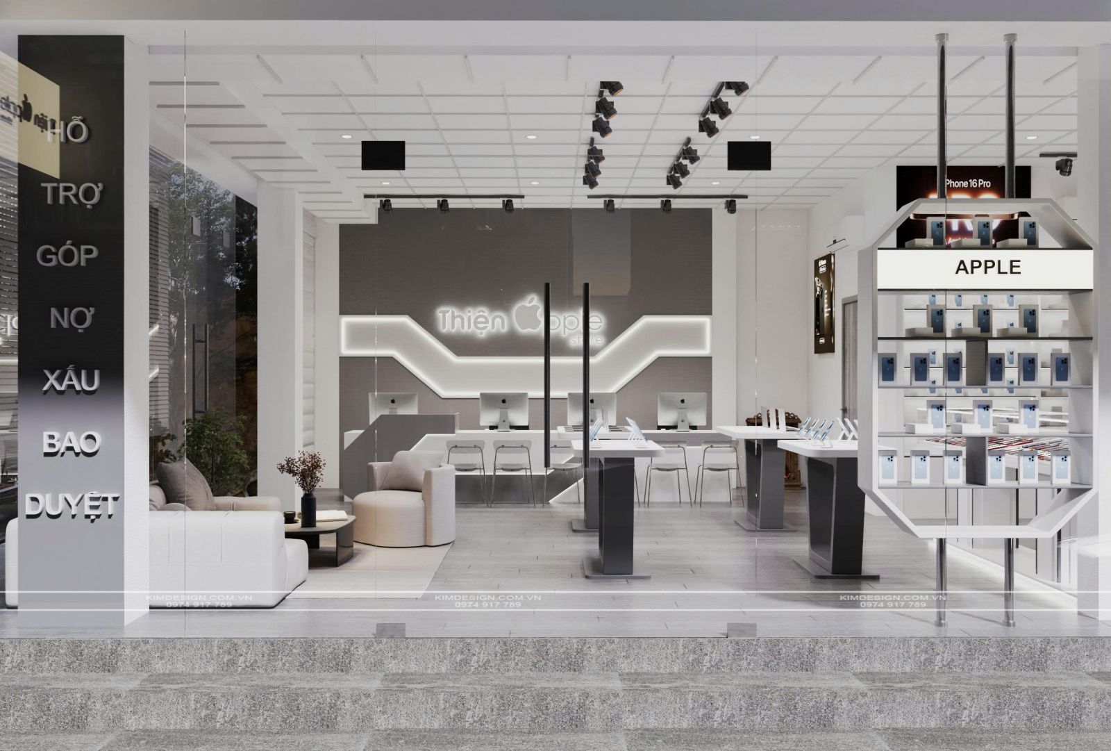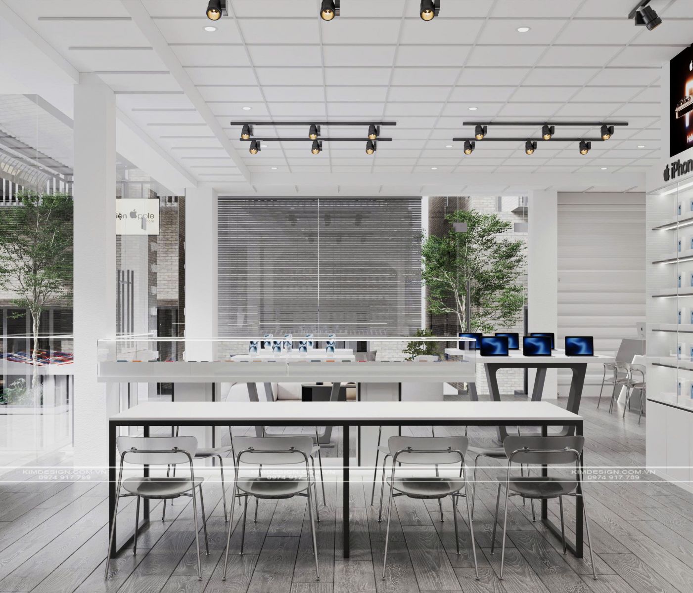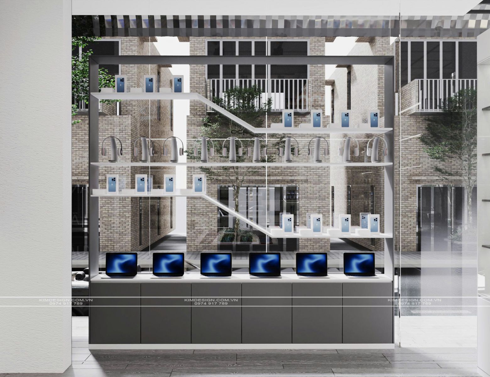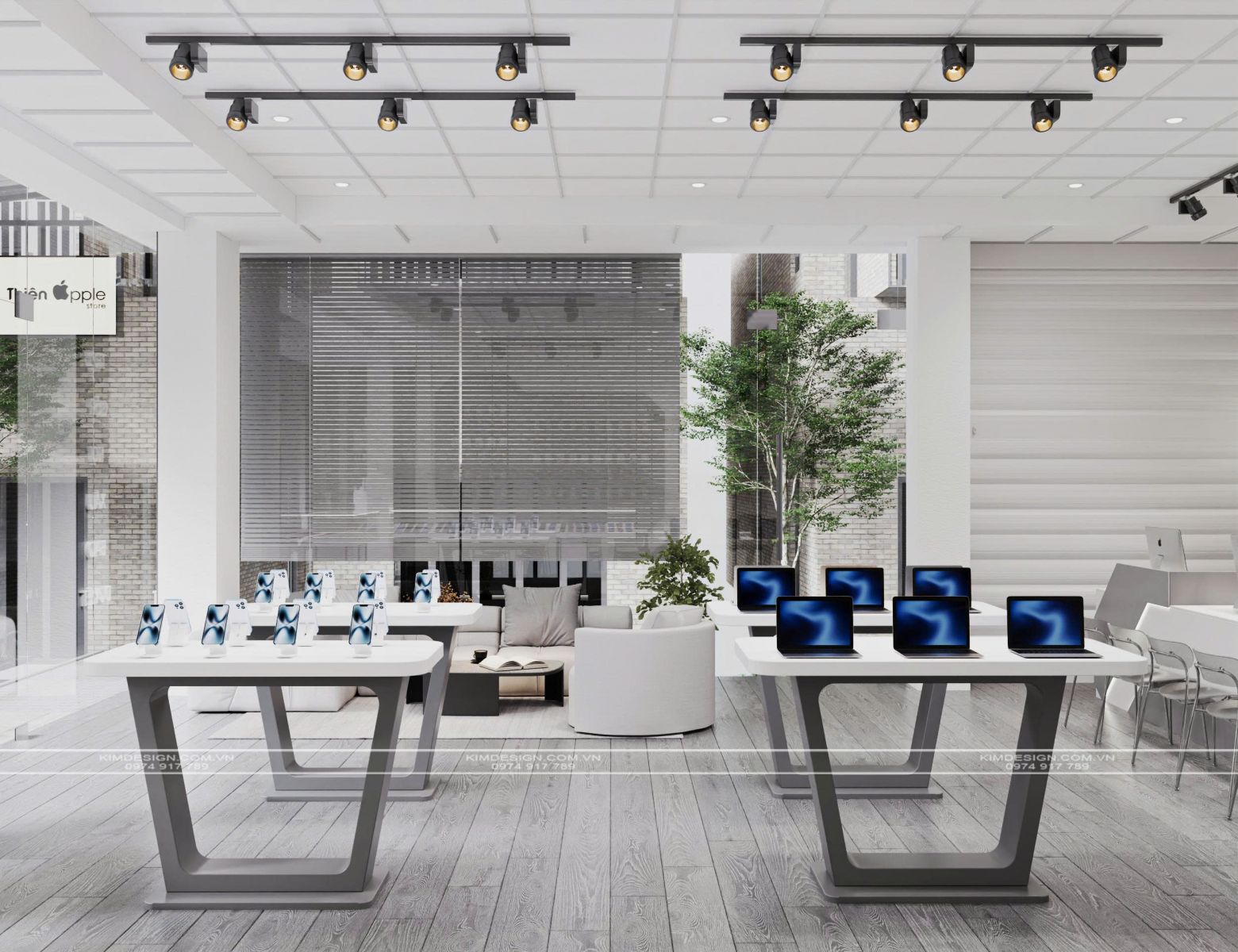 Bước vào không gian bên trong, khách hàng sẽ lập tức cảm nhận được sự rộng rãi, thoáng đãng nhờ thiết kế mở và hệ thống cửa kính cường lực bao phủ toàn bộ mặt tiền. Ánh sáng tự nhiên tràn ngập khắp mọi ngóc ngách, tôn lên vẻ đẹp của từng sản phẩm trưng bày. Các đường nét thẳng mạnh mẽ, dứt khoát được sử dụng xuyên suốt trong toàn bộ thiết kế, từ cách bố trí không gian đến từng chi tiết nội thất, mang đến sự tinh gọn, hiện đại và thể hiện rõ phong cách của một cửa hàng công nghệ.