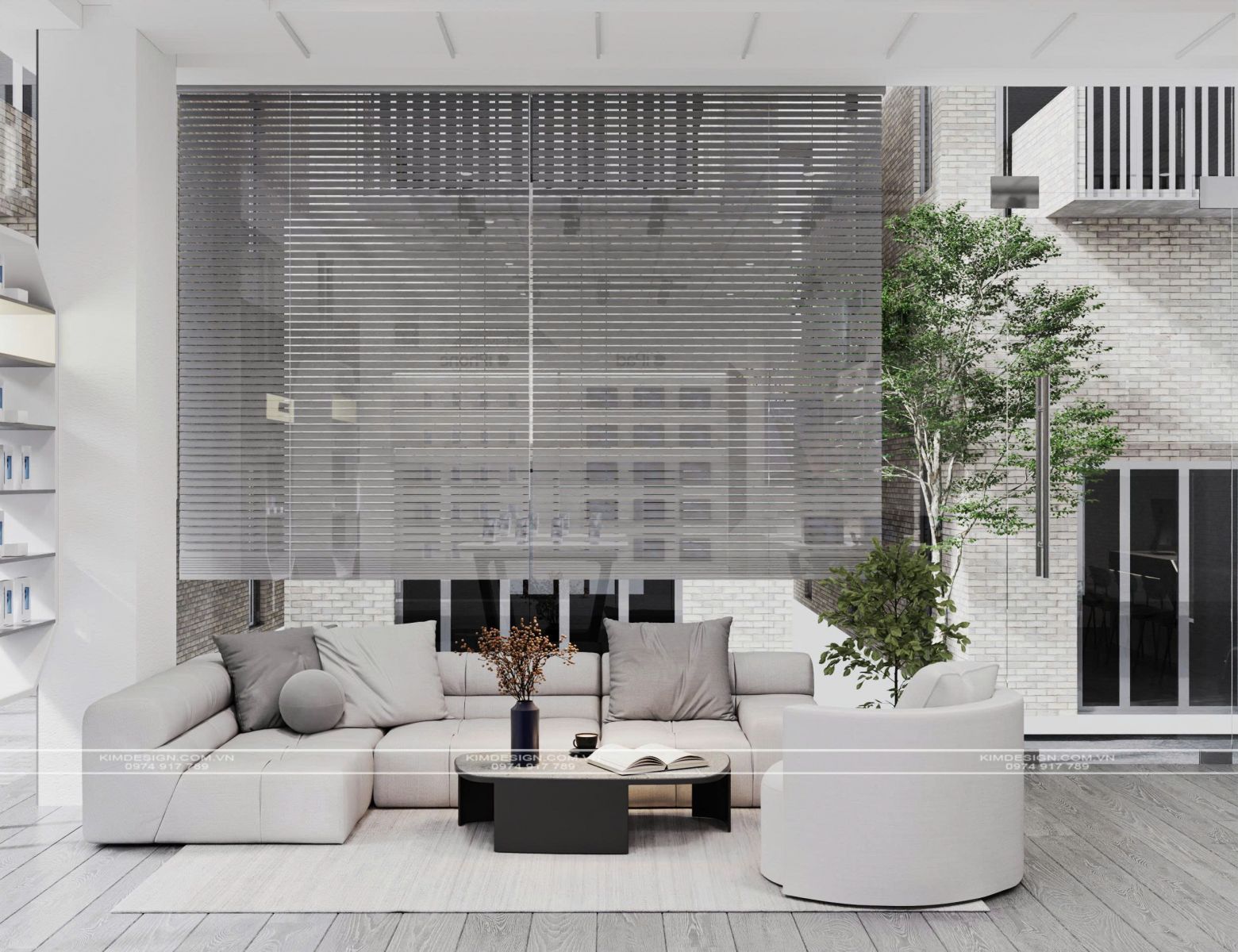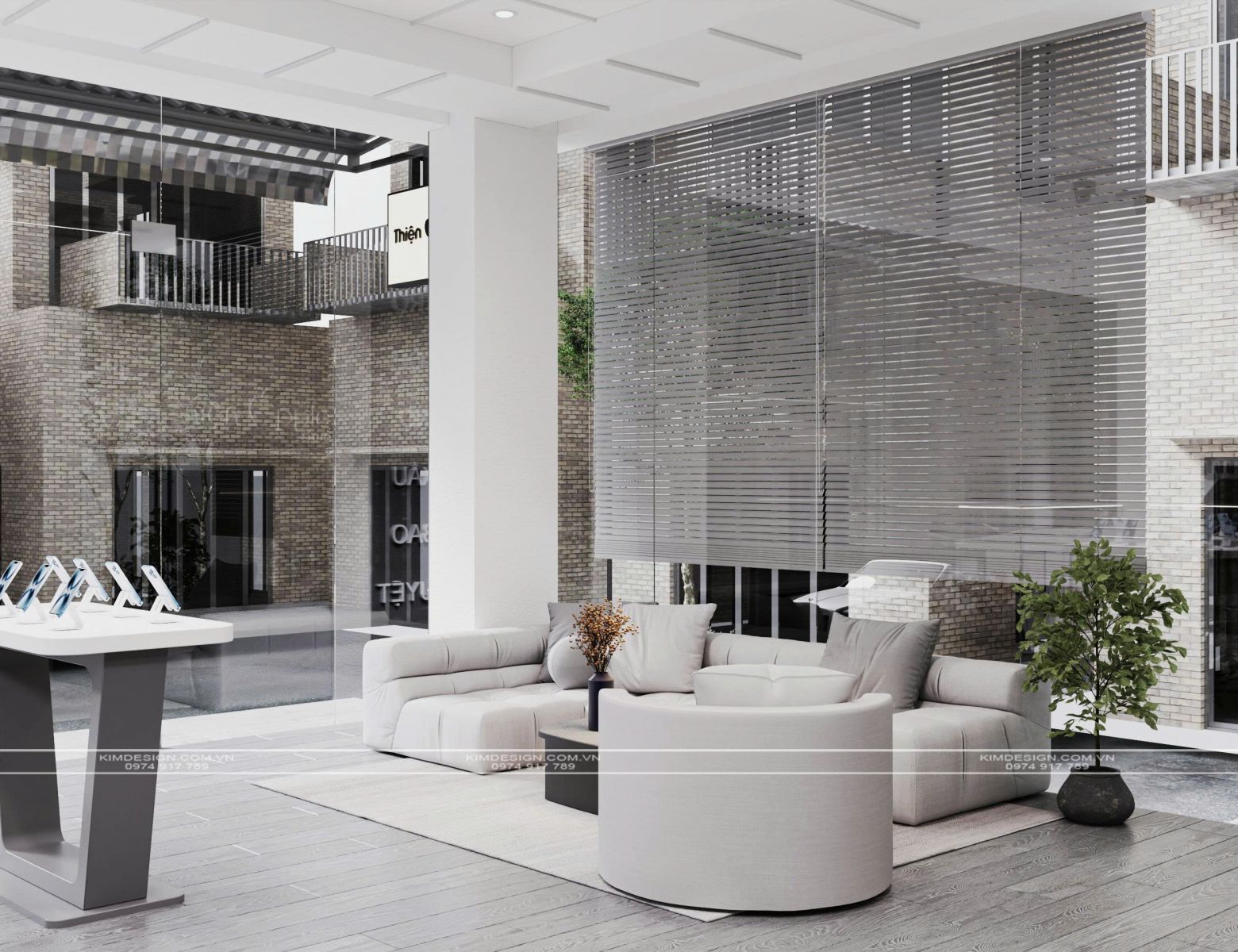 Ngay tại khu vực cửa ra vào, một khu vực chờ được bố trí tinh tế và tiện nghi, đặt bộ ghế sofa lớn êm ái cùng bàn trà thấp, là không gian lý tưởng để khách hàng ngồi nghỉ ngơi, chờ đợi khi chưa đến lượt. Sự sắp xếp này thể hiện sự quan tâm chu đáo đến trải nghiệm của khách hàng.