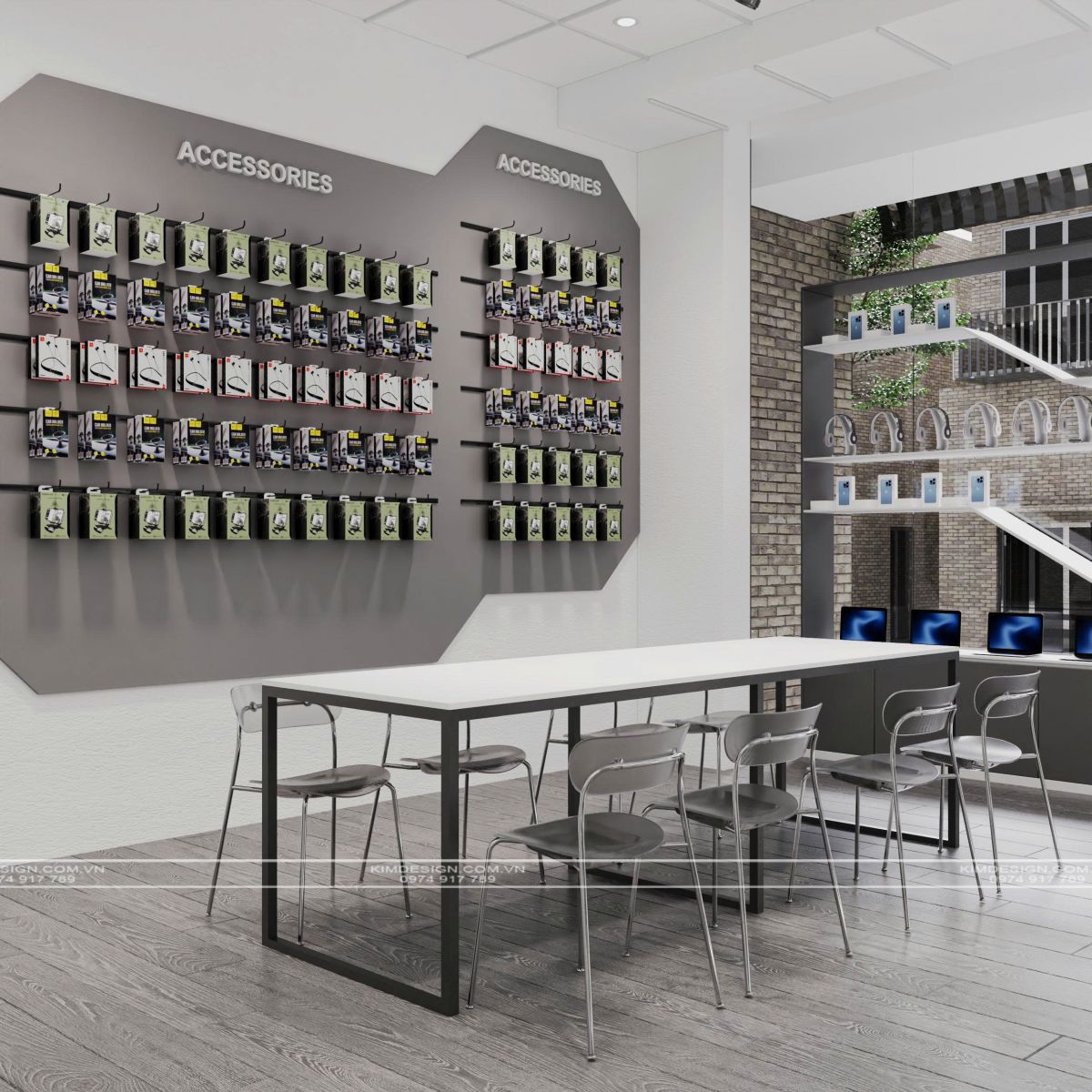 Ngoài ra, shop còn đặc biệt chú trọng đến việc trưng bày phụ kiện. Khu vực trưng bày phụ kiện được thiết kế thông minh bằng cách lắp đặt các móc treo trên nền gỗ MDF sơn xám ốp vách. Giải pháp này không chỉ phá vỡ sự đơn điệu của các mảng tường trắng trơn mà còn tận dụng tối đa không gian để trưng bày và bán các sản phẩm phụ kiện đa dạng, từ ốp lưng, tai nghe đến sạc dự phòng. Tại khu vực này, một chiếc bàn lớn với các ghế ngồi được bố trí hợp lý, đáp ứng nhu cầu tư vấn chuyên sâu và hỗ trợ khách hàng hoàn tất các hồ sơ mua bán sản phẩm một cách thuận tiện nhất. Tất cả những yếu tố trên hòa quyện lại, hình thành nên một showroom trưng bày điện thoại vô cùng đẳng cấp và chuyên nghiệp.