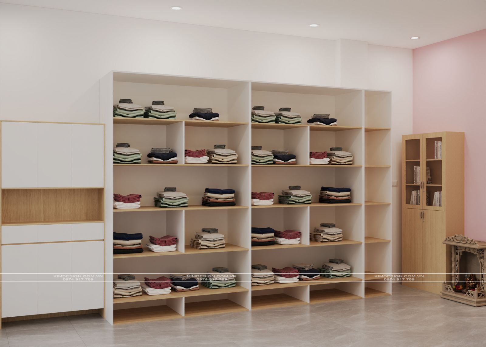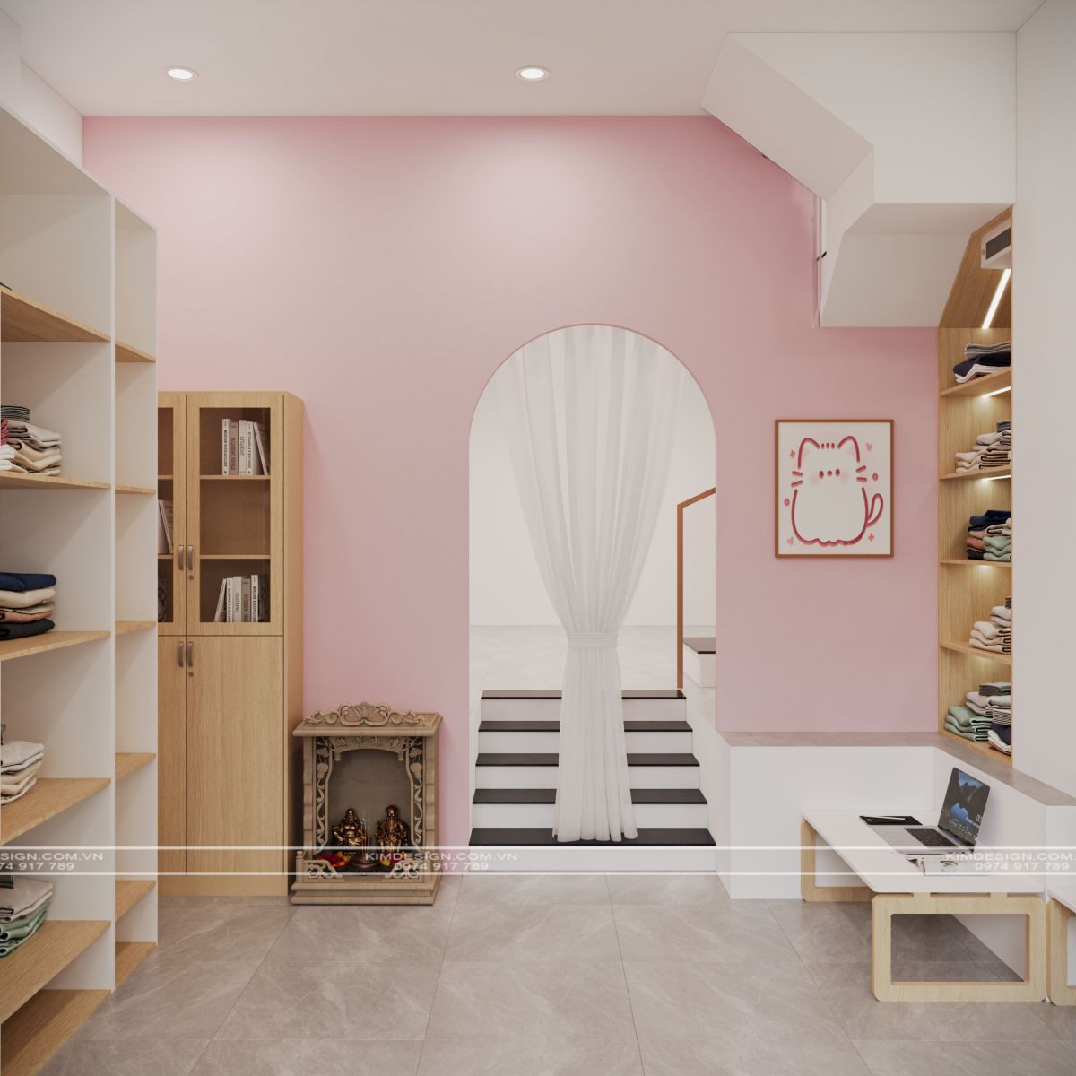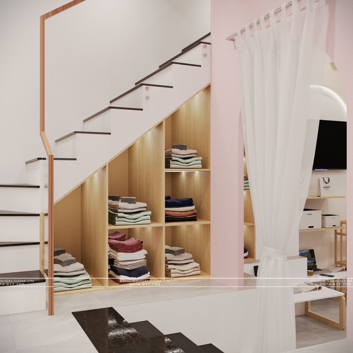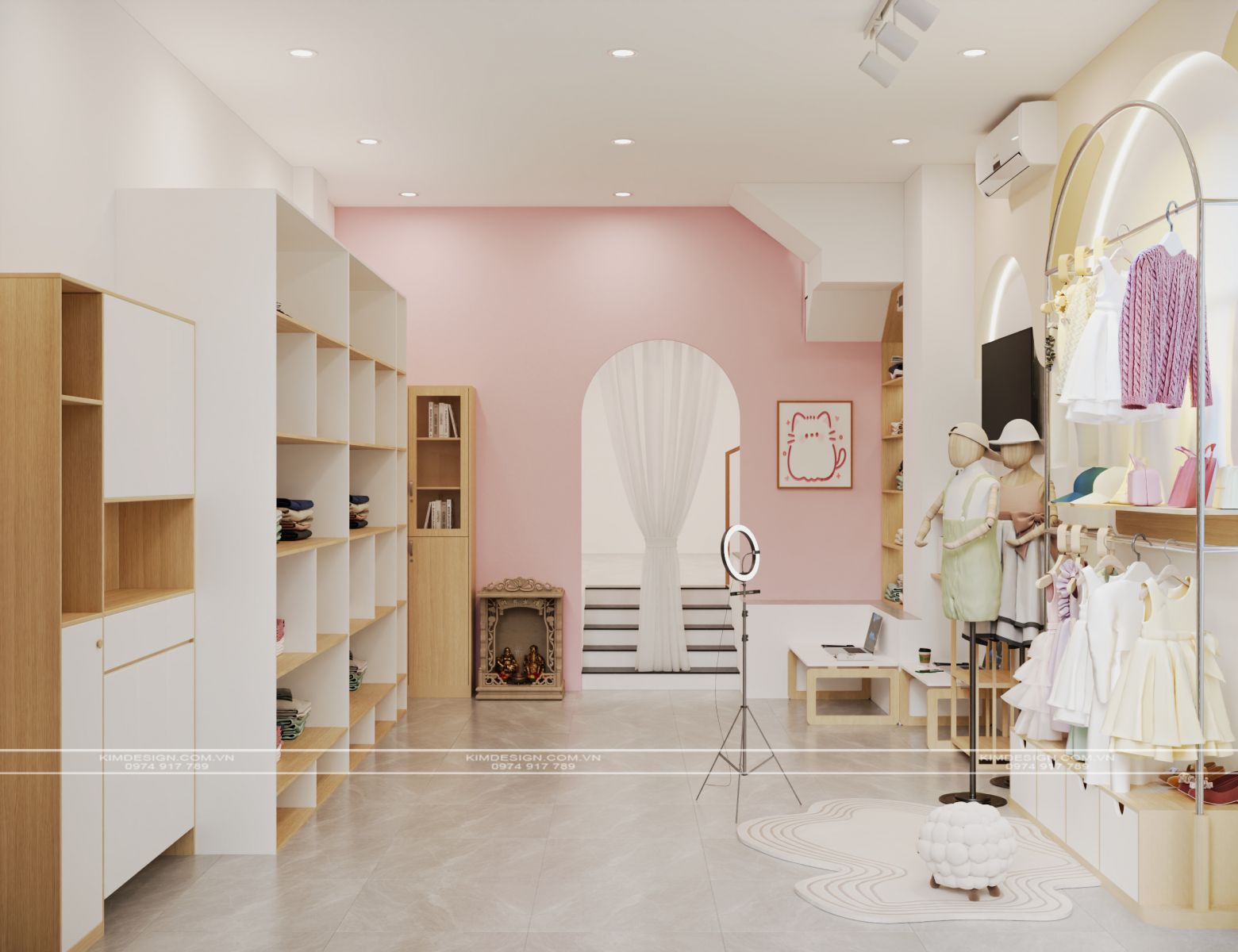 Sự thông minh trong thiết kế nội thất được thể hiện qua cách tối ưu hóa không gian. Những hệ kệ gỗ cao kịch trần với nhiều ngăn ô vuông vức được bố trí dọc theo các bức tường, giúp việc sắp xếp quần áo đã gấp gọn trở nên khoa học và thẩm mỹ. Đặc biệt, khu vực gầm cầu thang vốn thường bị bỏ trống đã được tận dụng khéo léo để lắp đặt các ngăn kệ có đèn, biến góc chết thành một điểm trưng bày đầy nghệ thuật. Vì là một không gian phục vụ cho việc kinh doanh online, khu vực trung tâm được dành cho linh hồn của shop: góc livestream và chụp ảnh. Tại đây, hai mẫu trẻ em gỗ đứng cạnh chiếc đèn chuyên dụng. Ngay cạnh đó, góc làm việc nhỏ gọn, giúp chủ nhân có thể vừa chốt đơn vừa quản lý hàng hóa một cách thuận tiện nhất.