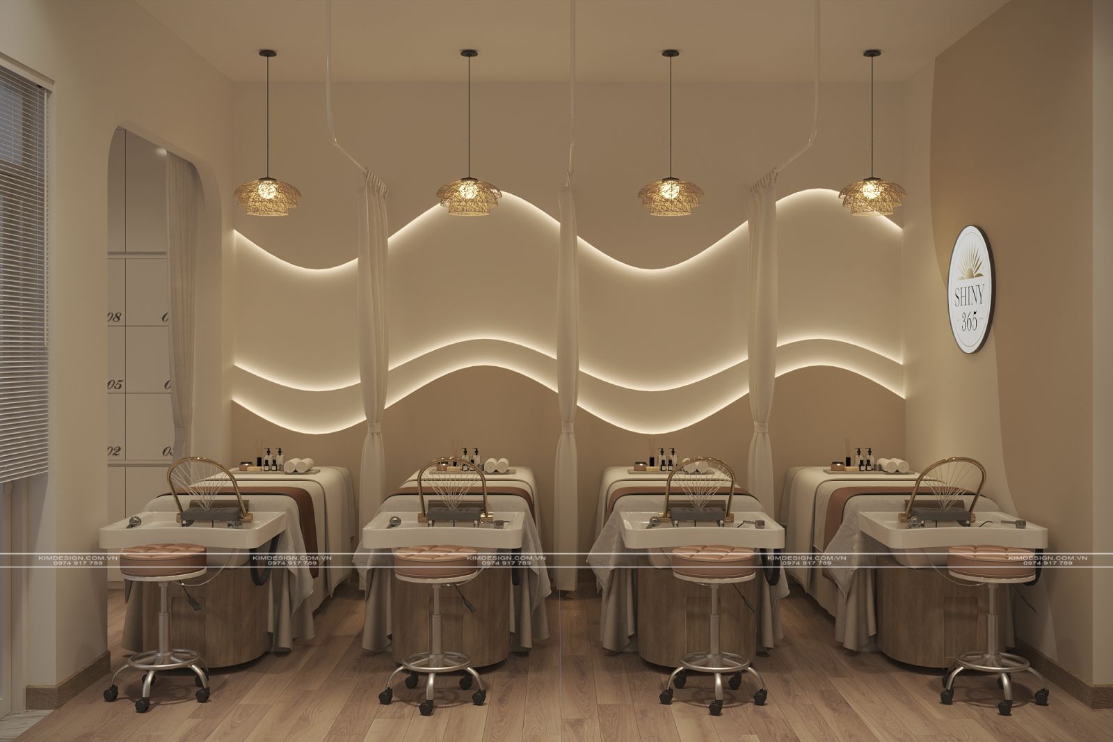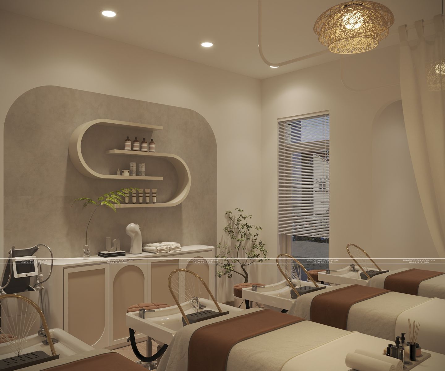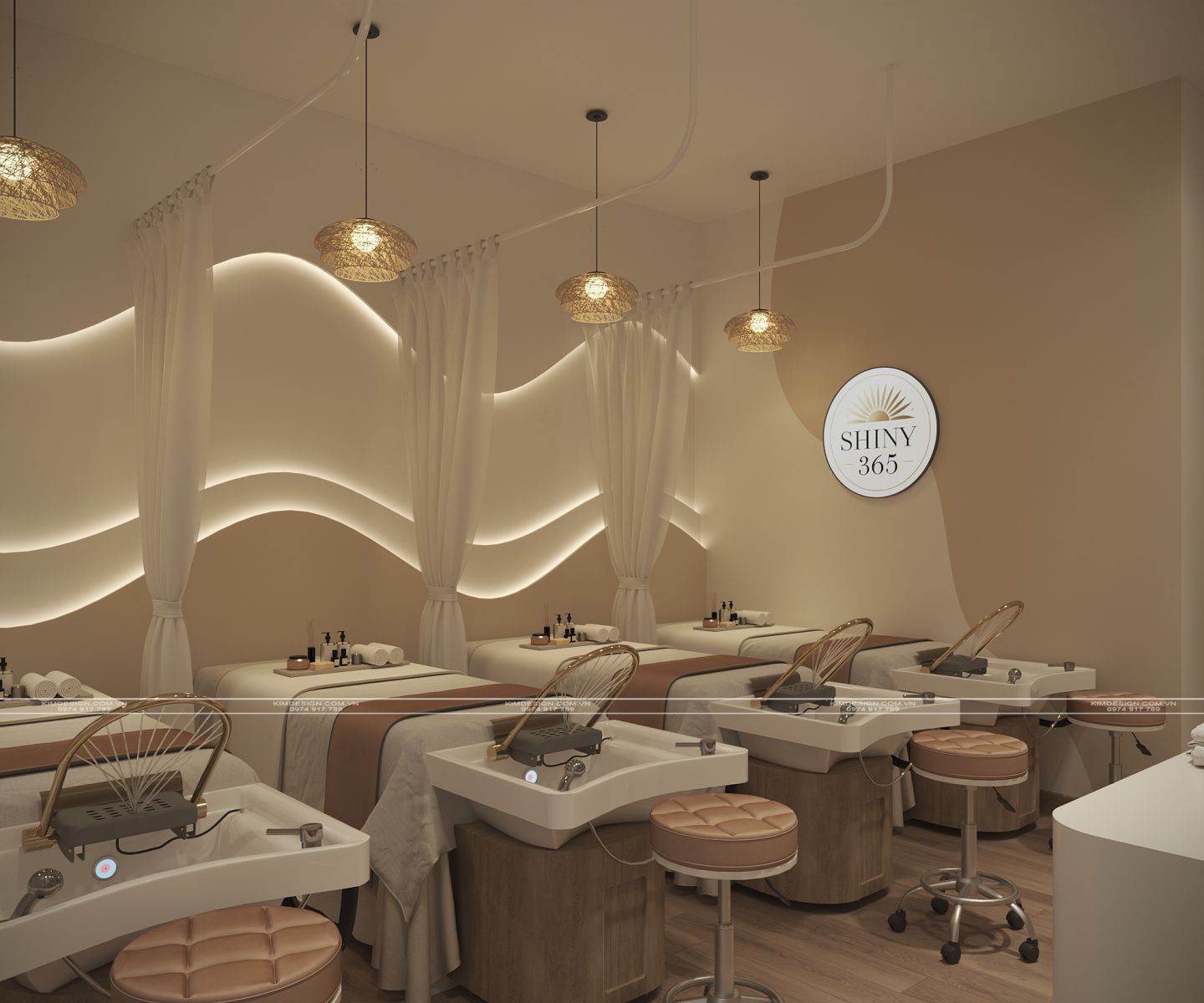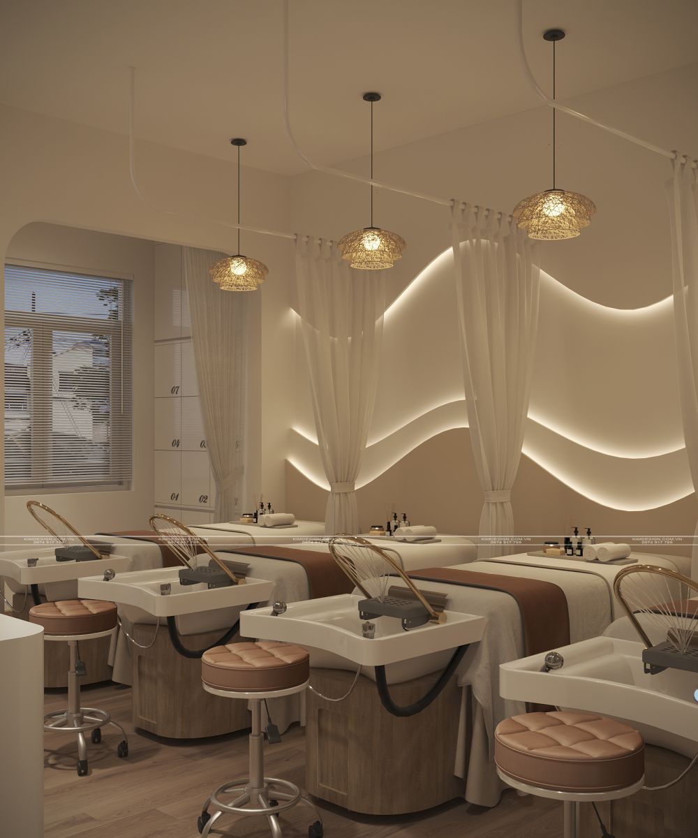Các phòng dịch vụ chuyên biệt được thiết kế dựa trên nguyên tắc riêng tư và hiệu quả. Khu vực trị liệu và chăm sóc được khéo léo phân chia bằng rèm voan mỏng manh hoặc vách ngăn cong, đảm bảo sự riêng tư mà vẫn giữ được cảm giác thông thoáng. Các thiết bị hiện đại được sắp đặt tinh tế, khẳng định tính chuyên nghiệp của dịch vụ. Trong khi đó, không gian dành cho gội đầu dưỡng sinh và nail lại sử dụng ánh sáng vàng từ đèn lồng mây tre đan, tạo cảm giác thân mật và gần gũi như đang ở trong một khu nghỉ dưỡng cá nhân.