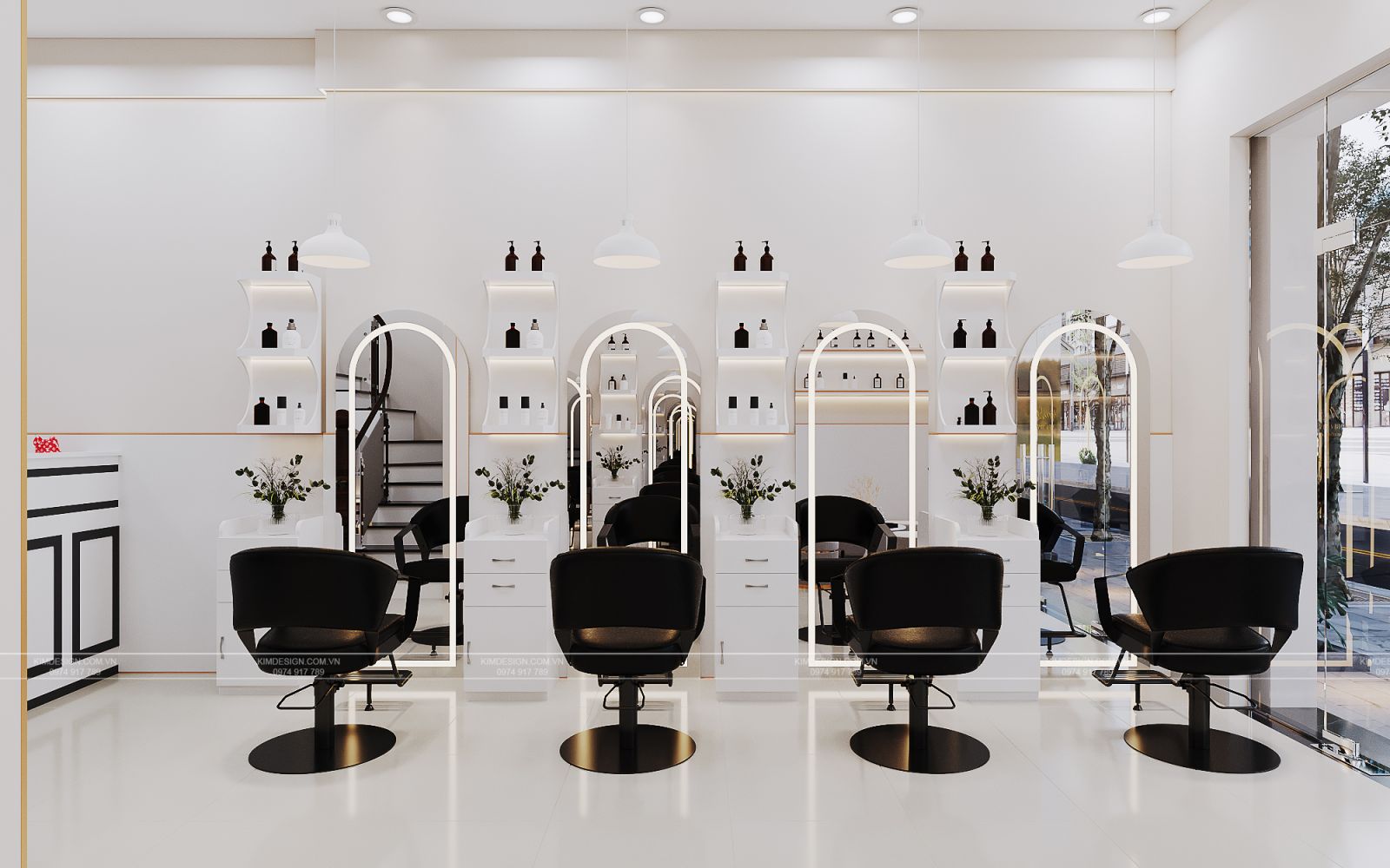 Ngay tại khu vực sảnh chính, khu vực chờ được bài trí tối giản nhưng đầy phong cách với những chiếc ghế đôn tròn bọc nỉ màu xám bạc. Đối diện đó, khu vực salon tóc đầy chuyên nghiệp với dãy ghế cắt đen tuyền. Điểm nhấn đắt giá nhất chính là hệ gương vòm, được bao bọc bởi dải đèn led ánh sáng dịu nhẹ, tạo hiệu ứng thị giác mở rộng không gian và tôn vinh vẻ đẹp của khách hàng. Phía sau mỗi vị trí ngồi là những kệ tủ trắng tích hợp nhiều ngăn kéo để cất trữ dụng cụ, giúp không gian luôn gọn gàng và ngăn nắp.