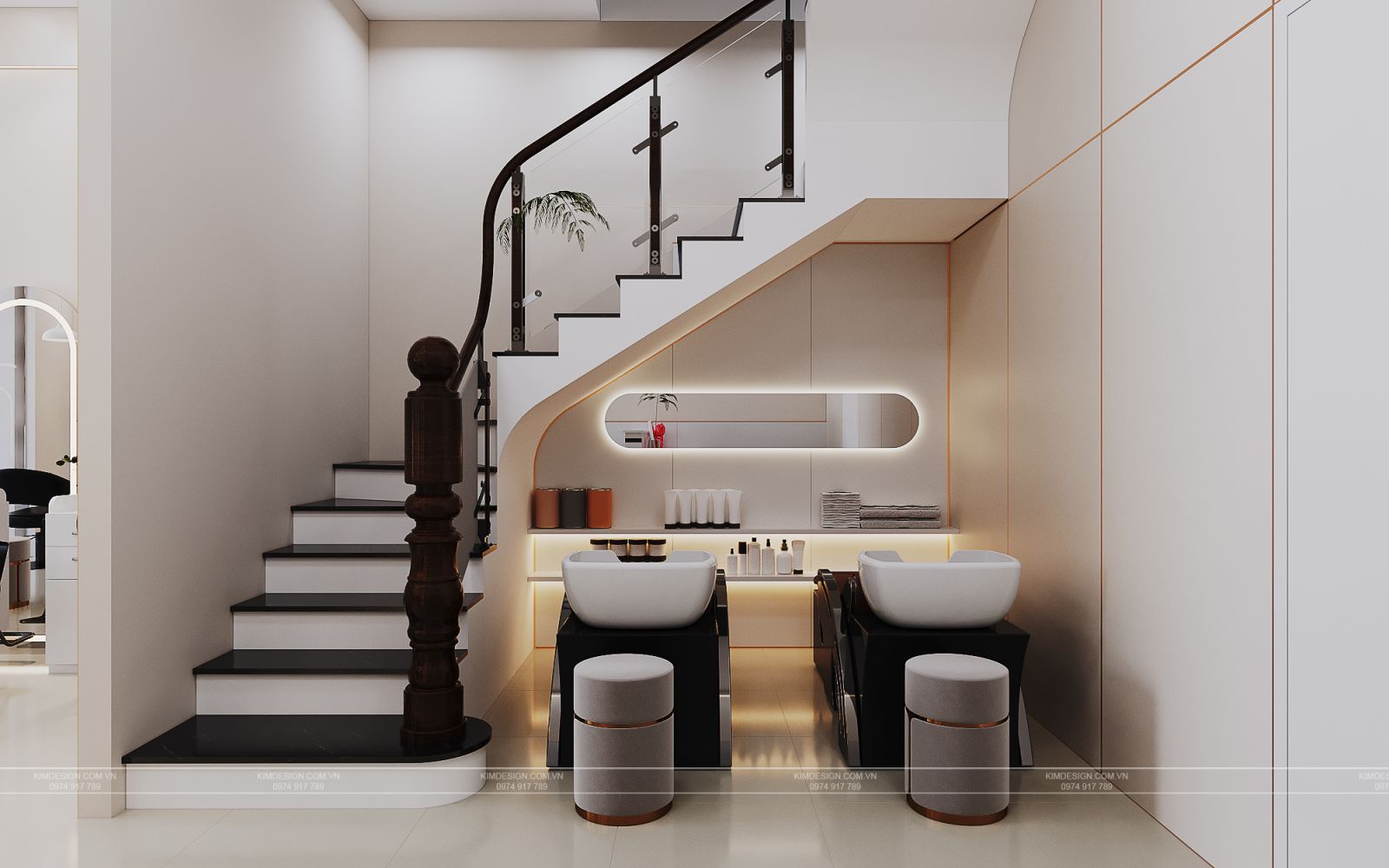Sự tinh tế trong bố cục còn thể hiện ở việc tận dụng tối đa diện tích tại góc cầu thang. Dưới khoảng không vốn thường bị bỏ trống, nhà thiết kế đã khéo léo đặt vào hai bồn gội đầu hiện đại, đầy tiện nghi và ấm cúng. Men theo lối đi lên tầng trên, không gian spa dần tách biệt khỏi sự nhộn nhịp của khu vực làm tóc. Tại đây, ánh sáng được điều tiết trầm lắng hơn, thay vào đó là hệ đèn hắt tường dạng sóng nước mềm mại trên các vách trang trí