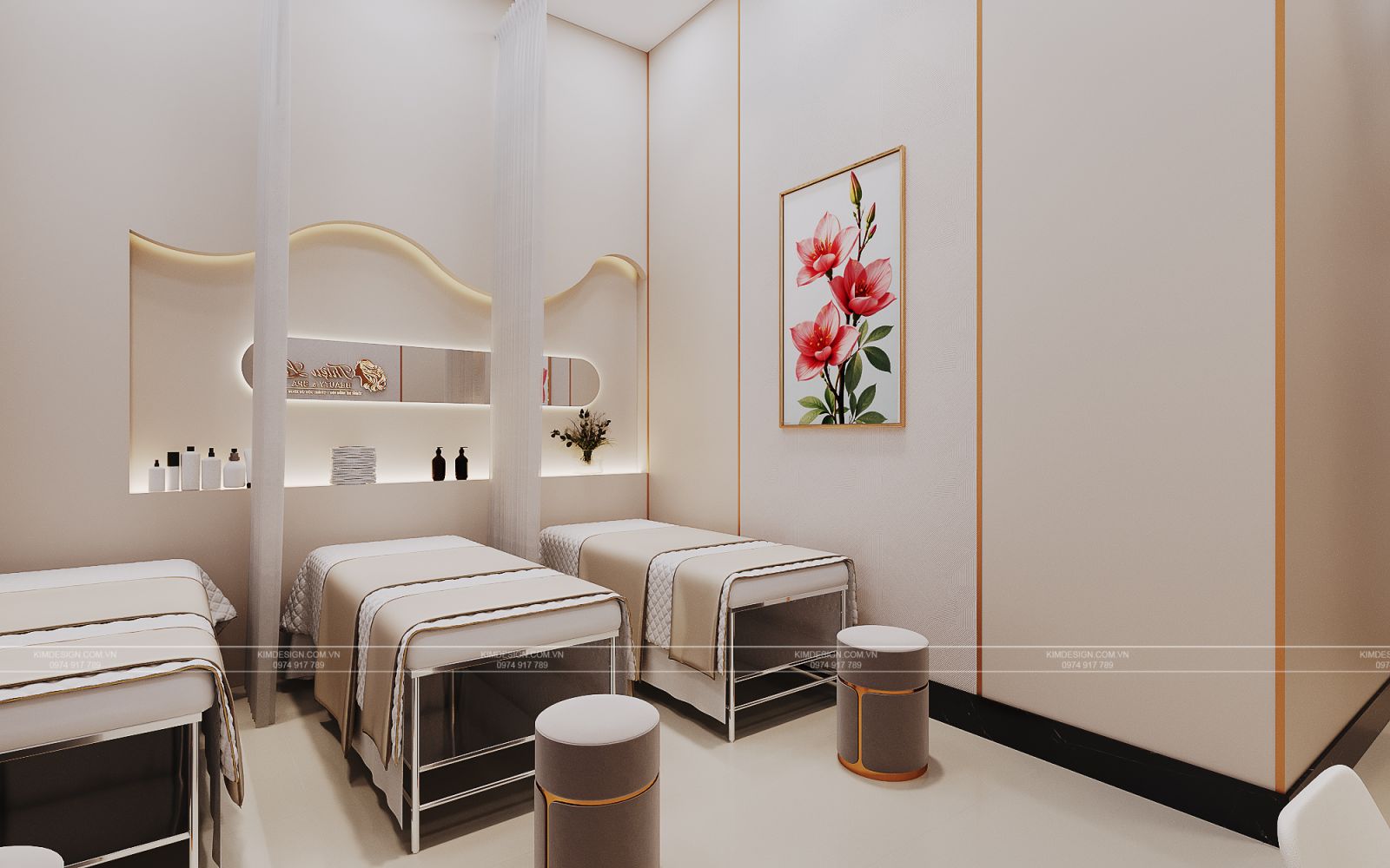 Phòng dịch vụ spa là sự kết hợp hoàn mỹ giữa công năng và thẩm mỹ. Những chiếc giường massage ngăn cách nhau bởi hệ rèm voan trắng mỏng manh, tạo sự riêng tư tuyệt đối mà vẫn giữ được độ thông thoáng. Điểm xuyết trên những bức tường trắng là các bức tranh khổ lớn, mang hơi thở thiên nhiên vào căn phòng. Cuối phòng, khu vực tư vấn và soi da được bố trí với bàn làm việc đôi tối giản, khẳng định sự chuyên nghiệp và chu đáo của thương hiệu