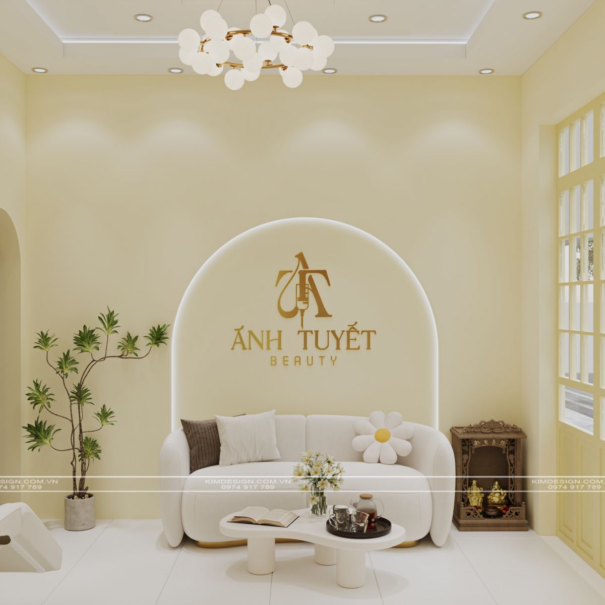 Không gian spa được thiết kế theo phong cách tối giản nhưng vẫn vô cùng ấm cúng và sang trọng. Tông màu chủ đạo là sự pha trộn tinh tế của màu vàng kem dịu mắt và màu nâu đất trầm ấm, tạo cảm giác thư thái và gần gũi ngay từ cái nhìn đầu tiên. Sàn nhà lát gạch men trắng sáng bóng giúp phản chiếu ánh sáng, làm không gian thêm phần rộng rãi và sạch sẽ. Các chi tiết đường cong mềm mại, từ vòm cửa, kệ trưng bày, đến logo và gương soi, là điểm nhấn xuyên suốt, tạo nên sự đồng nhất và hài hòa, mang lại cảm giác an toàn và dễ chịu cho khách hàng.