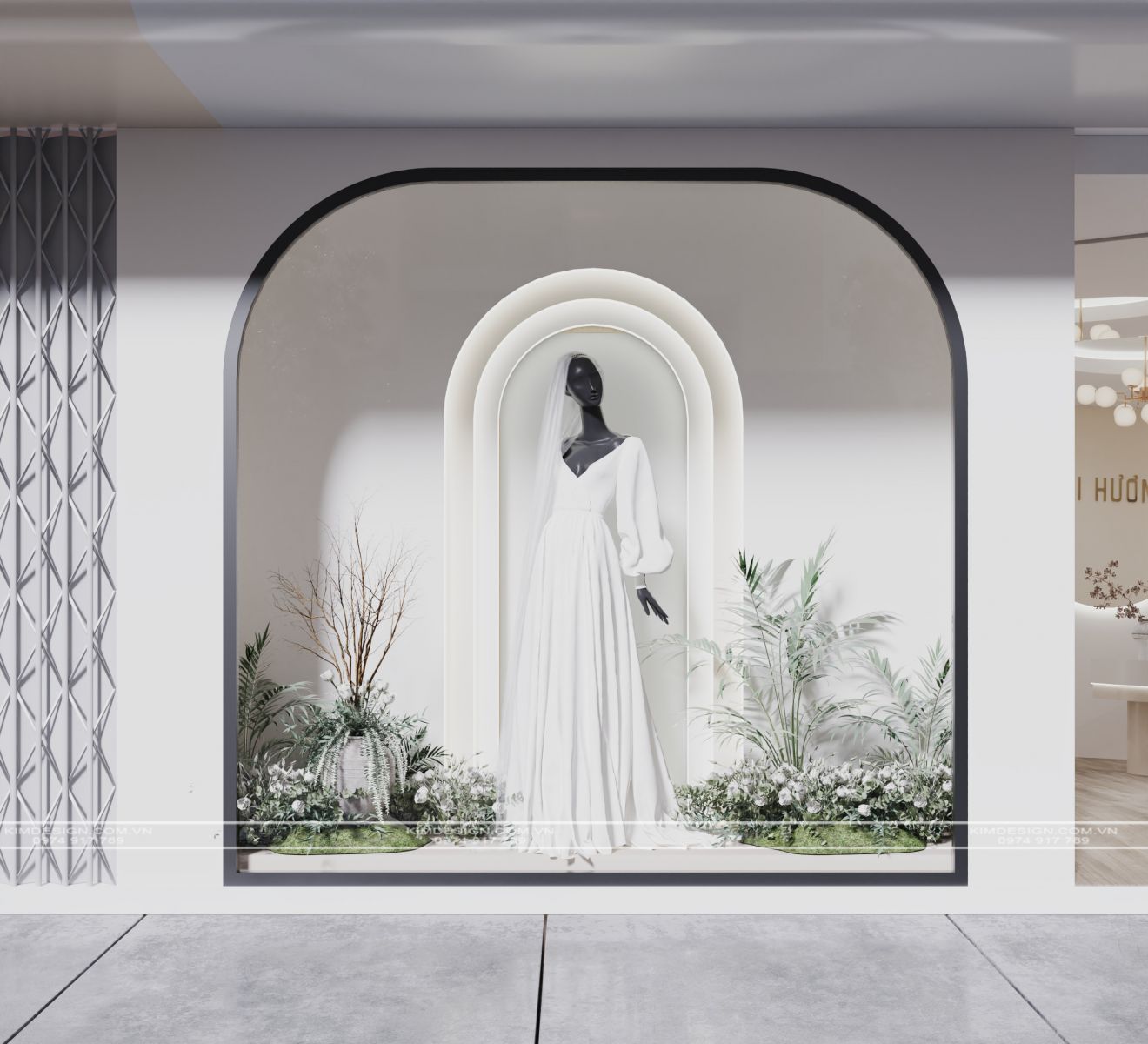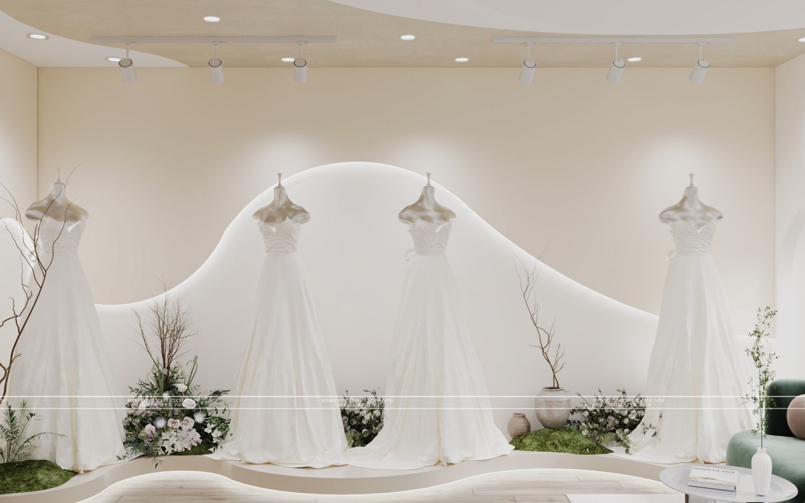 Tổng thể, thiết kế của studio cưới này là sự kết hợp hoàn hảo giữa sự sang trọng, hiện đại và lãng mạn. Mỗi chi tiết, từ đường cong mềm mại của quầy lễ tân đến cách bố trí ánh sáng và các bục trưng bày, đều được tính toán kỹ lưỡng để tạo ra một không gian không chỉ đẹp mắt mà còn khơi gợi cảm xúc, biến việc lựa chọn trang phục cưới trở thành một trải nghiệm đáng nhớ và trân trọng.