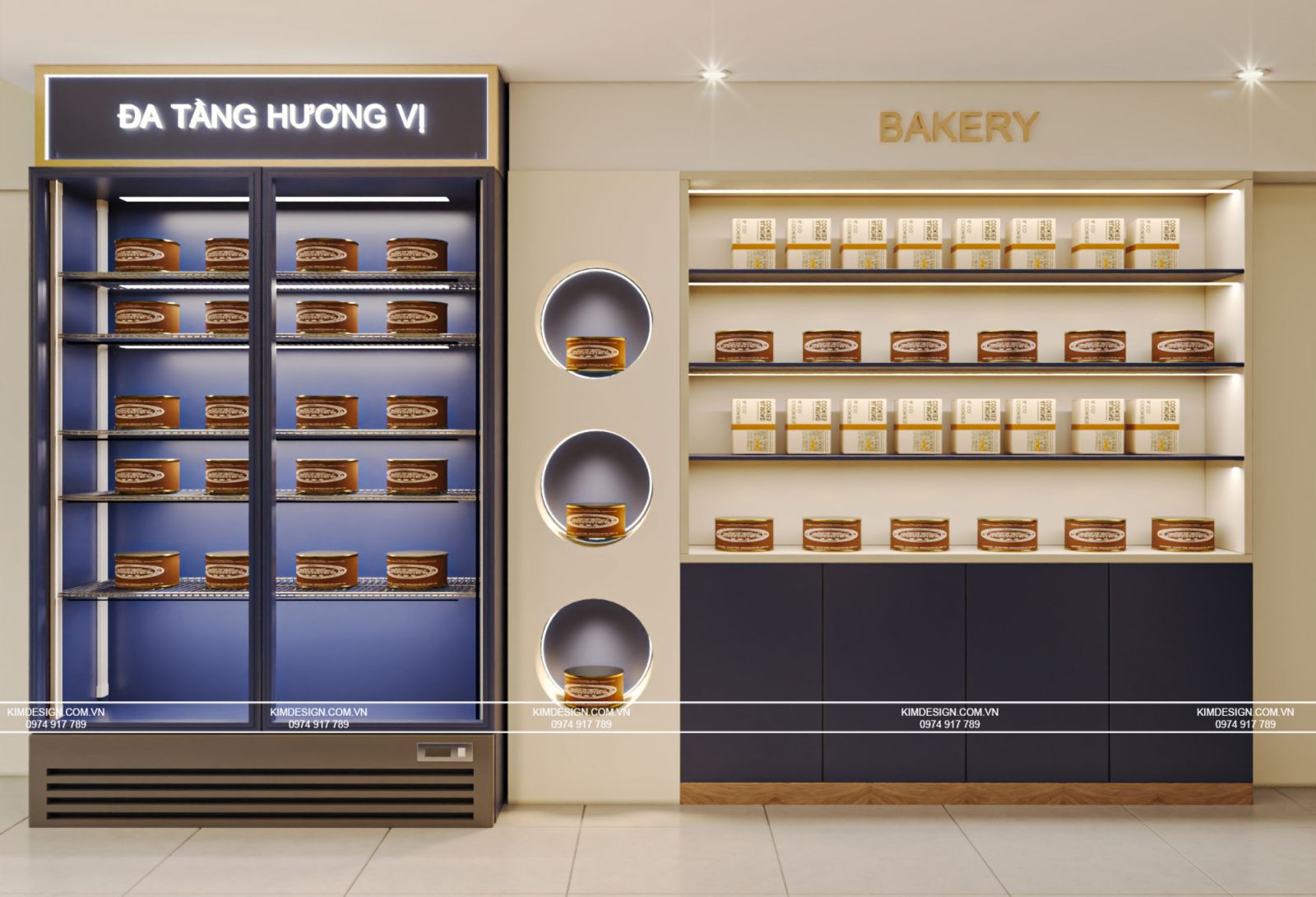 Phía sau khu vực trung tâm là một hệ thống kệ trưng bày được thiết kế thông minh và đa dạng. Những chiếc kệ được bố trí khoa học, vừa đảm bảo tính thẩm mỹ, vừa tối ưu hóa không gian trưng bày các sản phẩm khác như bánh mì, đồ uống đóng gói hay các vật phẩm quà tặng liên quan đến thương hiệu. Điểm nhấn đặc biệt ở khu vực này là bảng đèn LED ấn tượng, có thể hiển thị tên sản phẩm, thông tin khuyến mãi hoặc những hình ảnh đẹp mắt, thu hút sự chú ý của khách hàng. Bên dưới hệ thống kệ còn được tích hợp quầy nhỏ và một bồn rửa tay tiện lợi, thể hiện sự chu đáo và quan tâm đến trải nghiệm của khách hàng. Thiết kế khu vực trưng bày còn được biến tấu linh hoạt với nhiều hình thức, từ những tủ kệ âm tường gọn gàng, tiết kiệm diện tích đến những tủ giữ lạnh tiện nghi, đảm bảo chất lượng sản phẩm luôn tươi ngon.
