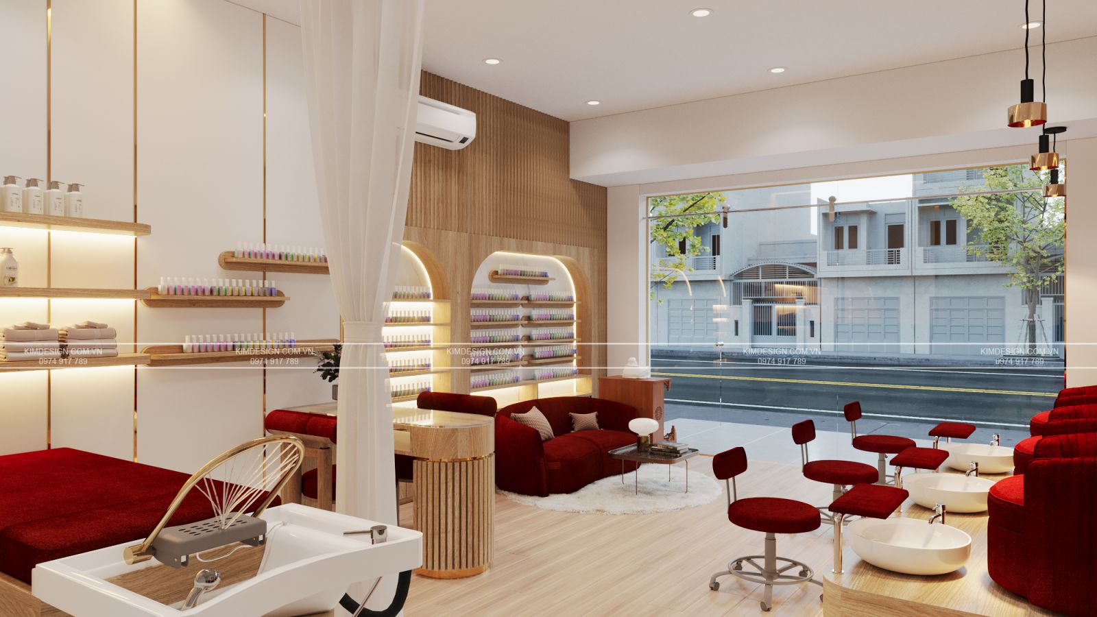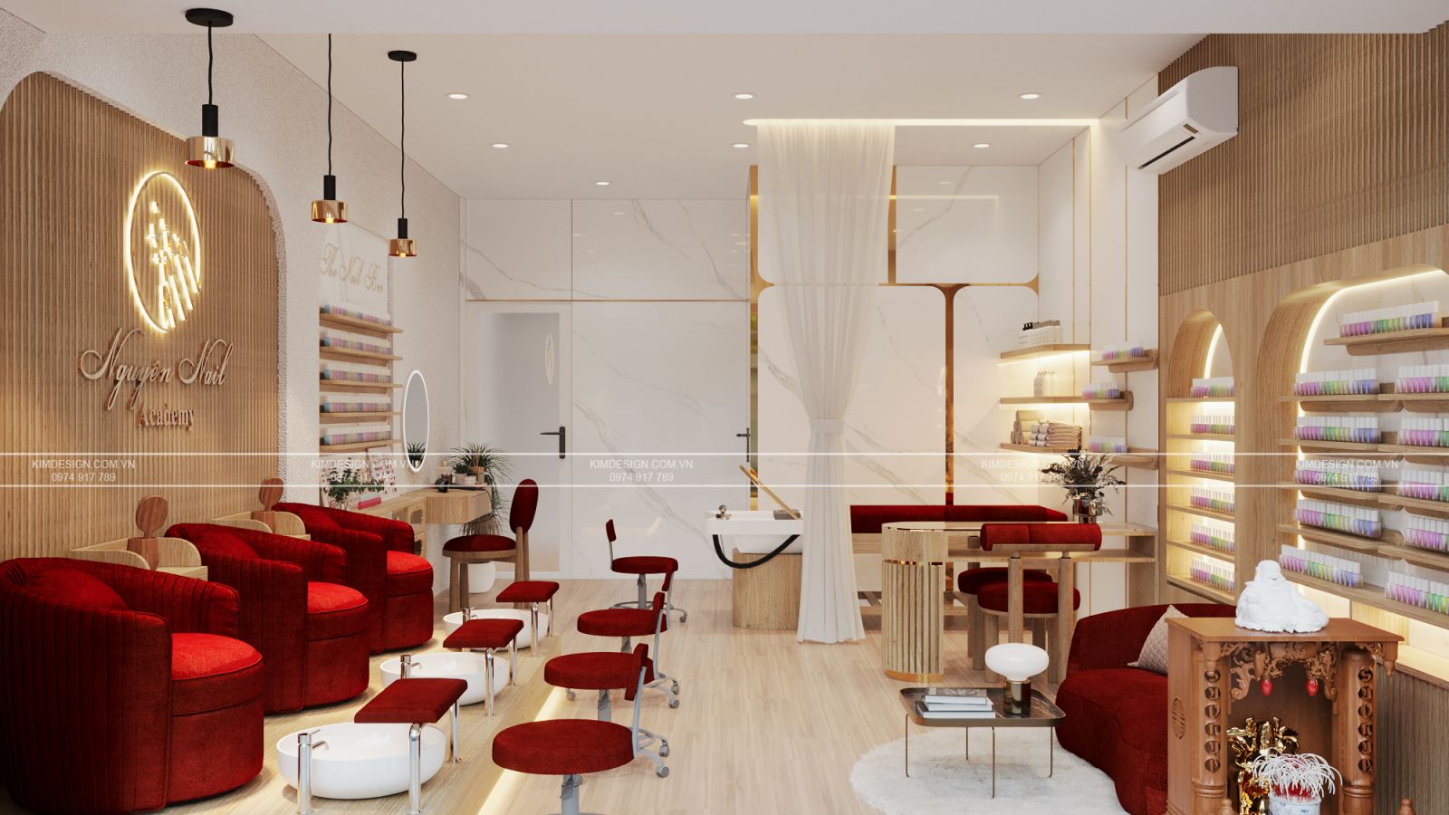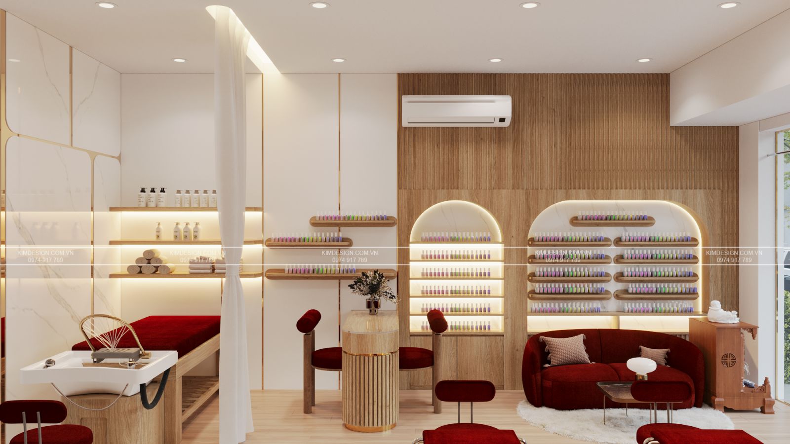 Bước qua cánh cửa kính, không gian nội thất mở ra một bản giao hưởng màu sắc đầy mê hoặc. Sự kết hợp hài hòa giữa sắc nâu mộc mạc của gỗ và điểm nhấn đắt giá là tông đỏ nhung quyến rũ, tạo nên một tổng thể vừa ấm áp, gần gũi lại vừa kiêu sa, đẳng cấp. Khu vực trung tâm được phân chia khoa học: một bên là khu vực nail chân với bục gỗ nâng cao, đặt ba chiếc ghế sofa đơn bọc nhung đỏ êm ái dành cho dịch vụ làm móng chân. Mảng tường phía sau trang trí tấm lam nhựa giả gỗ, làm nền cho logo phát sáng, khẳng định dấu ấn thương hiệu đầy chuyên nghiệp. Đối diện là khu vực làm móng tay và trưng bày, nơi những kệ sơn được thiết kế âm tường với hình vòm cung mềm mại, hắt ánh đèn led vàng dịu nhẹ, biến những lọ sơn móng tay nhỏ bé thành những vật phẩm trang trí bắt mắt. Phía trong cùng, sau tấm rèm voan trắng rủ nhẹ nhàng đóng vai trò phân cách khu vực, che chắn kín đáo cho khu vực giường gội và spa, đảm bảo sự riêng tư tương đối trong không gian mở.