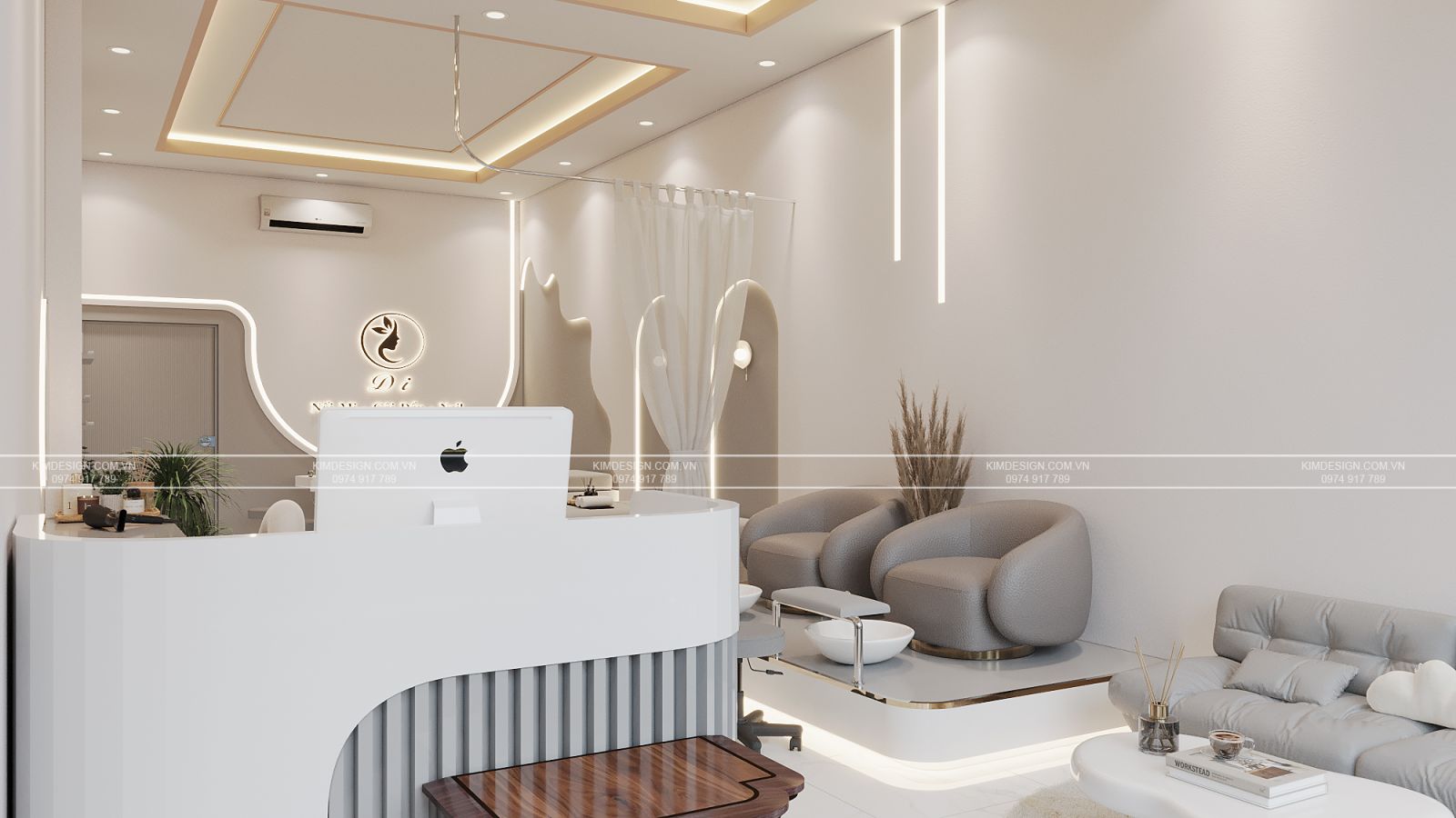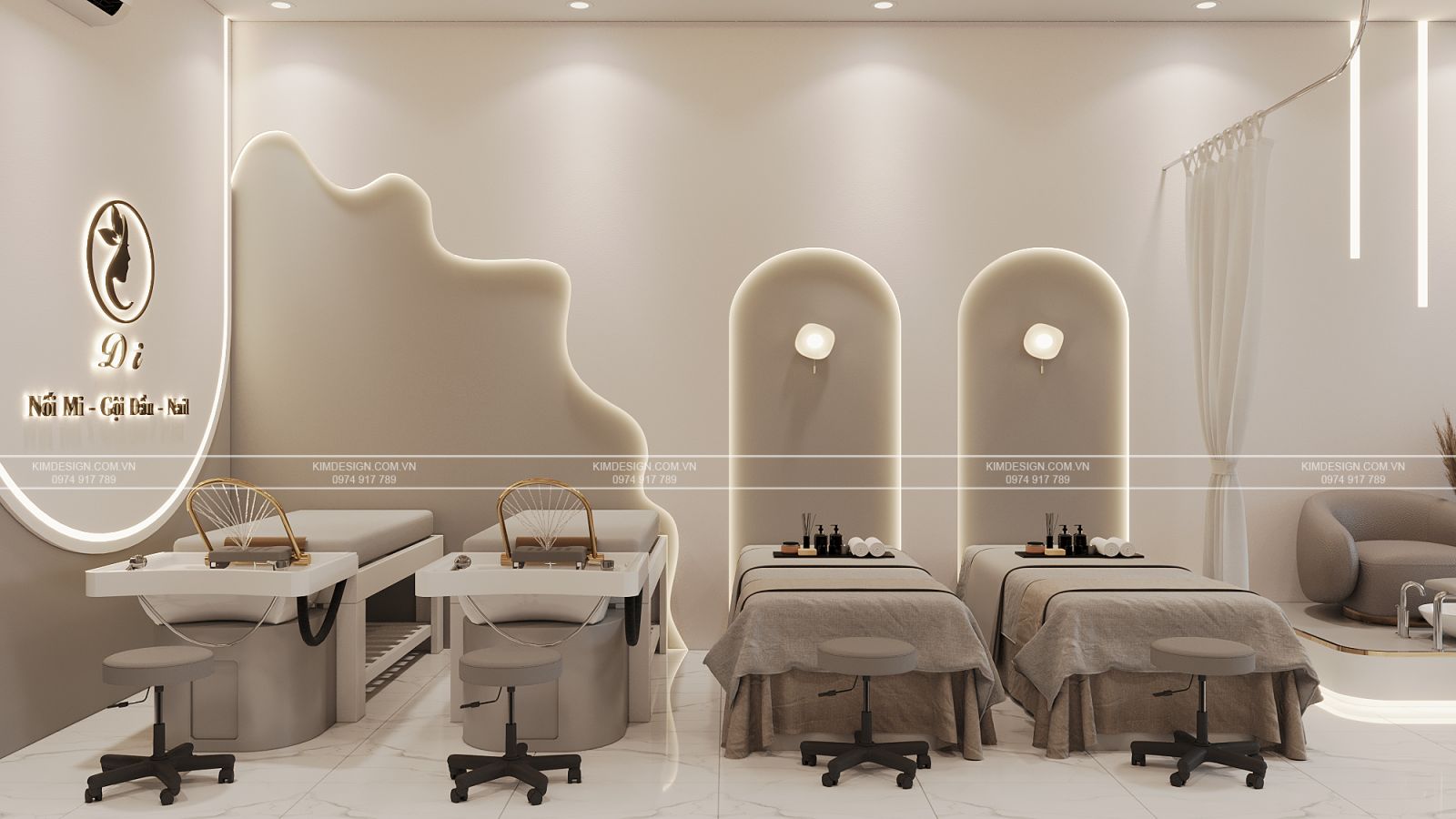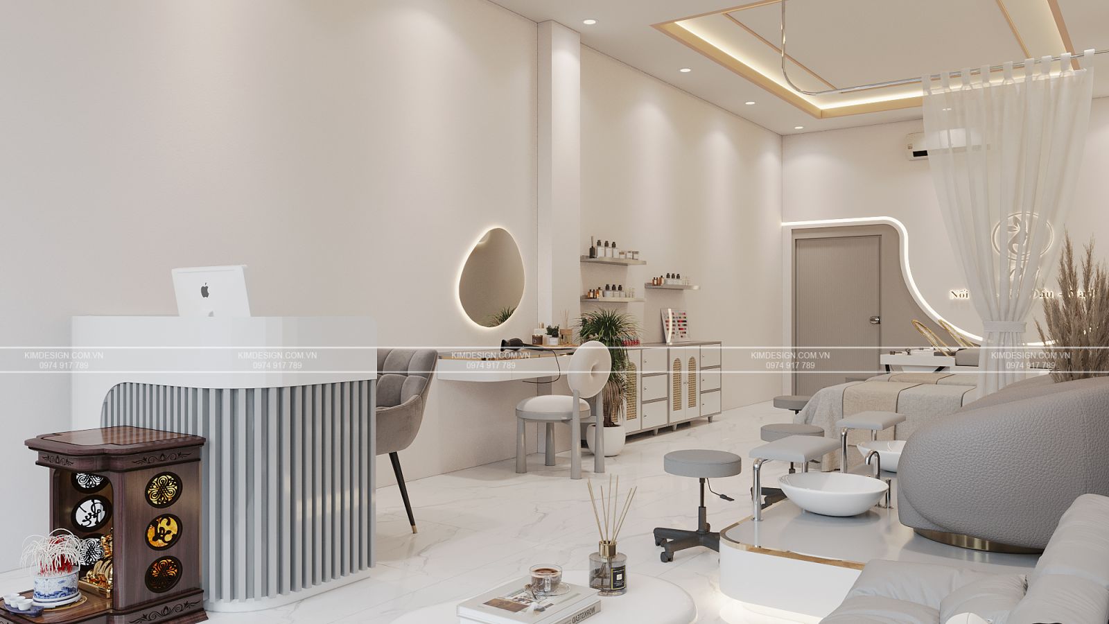 Mỗi góc nhỏ đều thể hiện sự chăm chút tỉ mỉ, kết hợp hoàn hảo giữa đường nét cong mềm mại và đường thẳng hiện đại đã tạo nên một tổng thể thiết kế spa đa năng đảm bảo thu hút đông đảo khách hàng. Thiết kế này là minh chứng rõ ràng nhất cho khẳng định diện tích khiêm tốn vẫn có thể kiến tạo nên một trải nghiệm ấn tượng, khó quên cho mọi khách hàng. Vậy thì còn chần chừ gì nữa mà không nhanh tay nhắn tin cho Kim Design để sở hữu cho mình một không gian tương tự với ưu đãi thiết kế hoàn toàn miễn phí!