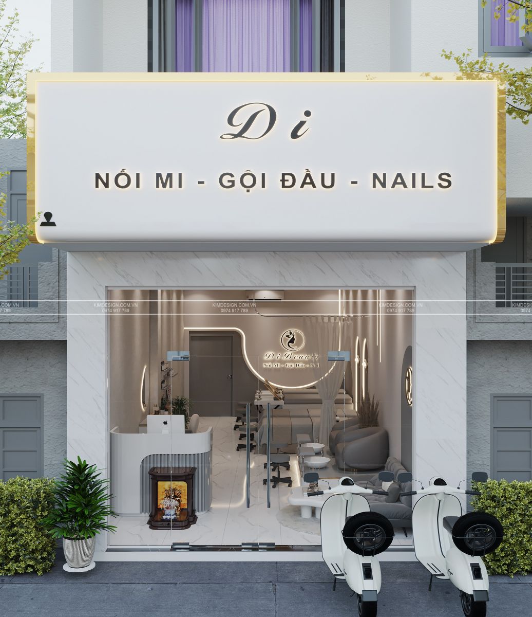 Ngay từ mặt tiền, tiệm đã gây ấn tượng với bảng hiệu có logo thương hiệu và thông tin dịch vụ rõ ràng. Cửa kính trong suốt mở rộng tầm nhìn vào bên trong, xóa nhòa ranh giới giữa không gian nội thất và ngoại thất. Khu vực tiếp tân được bố trí ngay gần cửa ra vào với một quầy lễ tân nhỏ gọn. Khu vực chờ được trang bị ghế sofa da và bàn thấp, tạo sự thoải mái, lịch sự. Tiến vào bên trong, không gian được phân chia tinh tế nhưng vẫn liền mạch. Toàn bộ không gian được bao phủ bởi tông màu trắng xám chủ đạo, mang lại cảm giác sạch sẽ, hiện đại và vô cùng thư thái. Khu vực làm đẹp chính tập trung ở phía sau. Đầu tiên là khu vực làm nail với bục ghế nail tích hợp bồn rửa tiện lợi. Khu vực nối mi và gội được bố trí riêng biệt sau rèm che với những chiếc giường bố trí khoảng cách khoa học. Điểm đặc sắc trong thiết kế nội thất là phần trần giật cấp viền alu vàng hắt led, sử dụng những đường cong trang trí vách, có đường viền đèn led âm tường, tạo cảm giác lung linh hơn cho không gian. Đối diện là khu vực bàn sấy tóc cùng tủ kệ trưng bày, tăng trải nghiệm khách hàng và tăng vẻ đẹp thẩm mỹ cho không gian tiệm.